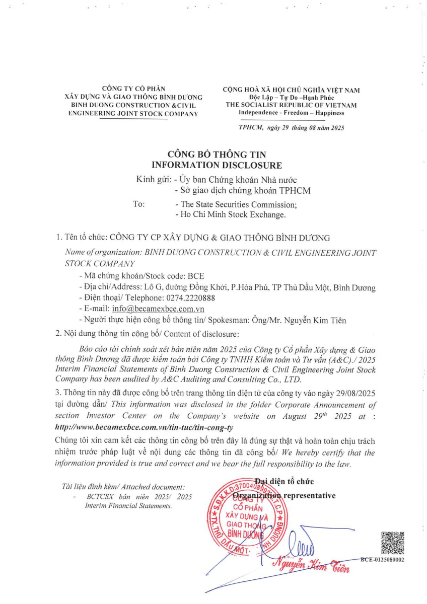 CÔNG BỐ THÔNG TIN BÁO CÁO TÀI CHÍNH SOÁT XÉT BÁN NIÊN 2025