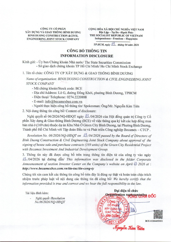CÔNG TY CỔ PHẦN XÂY DỰNG VÀ GIAO THÔNG BÌNH DƯƠNG CBTT NGHỊ QUYẾT SỐ 06/2026//NQ-HĐQT V/V THÔNG QUA KÝ KẾT CÁC HỢP ĐỒNG MUA BÁN NHÀ Ở THUỘC DỰ ÁN KHU NHÀ Ở GREEN CITY BÌNH DƯƠNG VỚI TẬP ĐOÀN BECAMEX TẠI ĐÂY