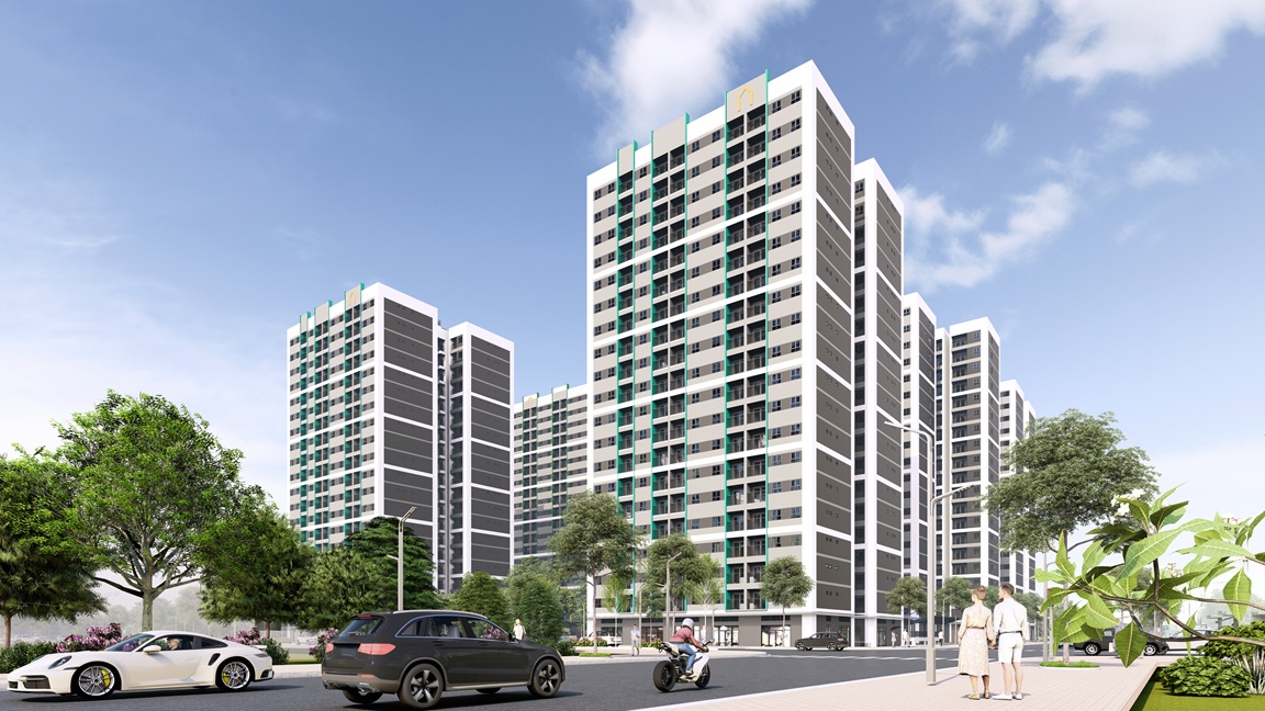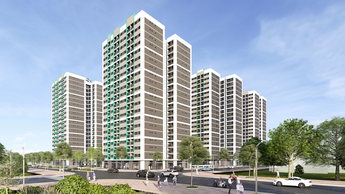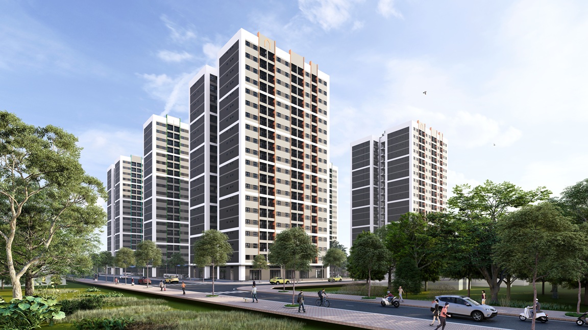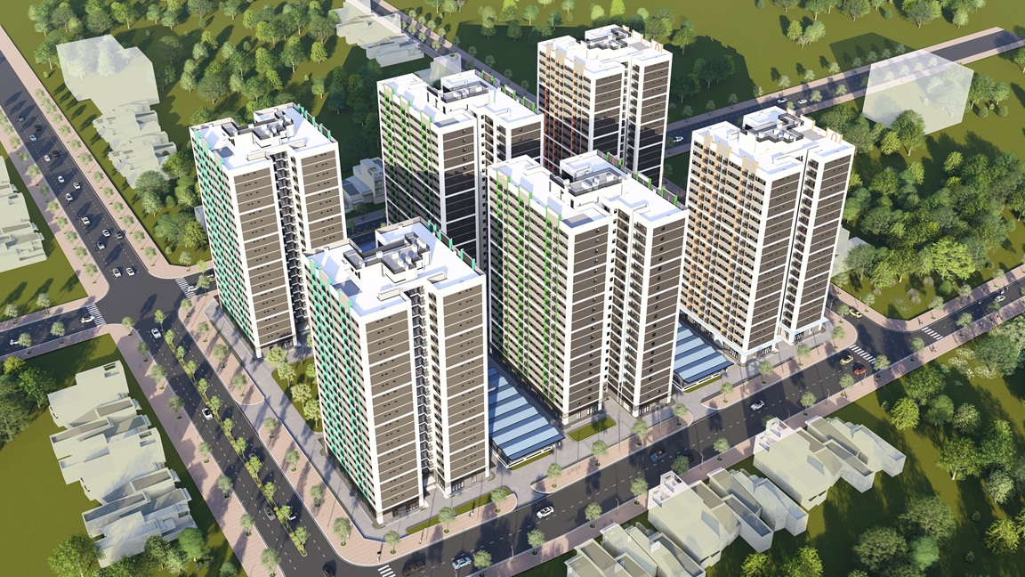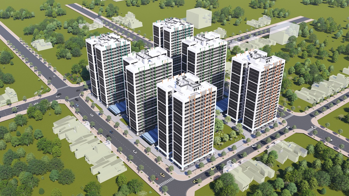 Gồm 6 khối nhà chung cư (H9, H10, H11, H12, G8, G9) cao 20 tầng và 1 tầng tum, 4 khối nhà xe (P1, P2, P3, P4) cao 2 tầng và 6 trạm điện