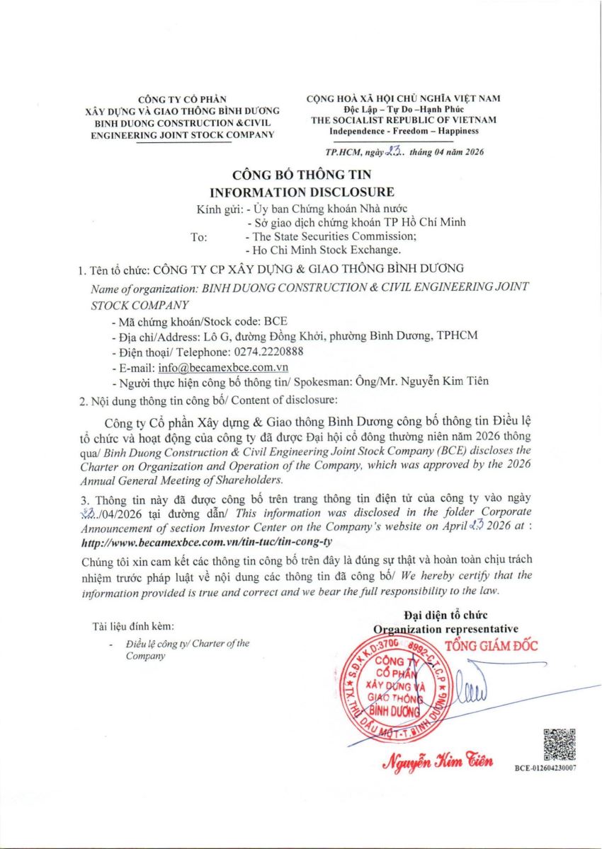 Quý cổ đông tải file Điều lệ tổ chức và hoạt động của Công ty BCE tại đây: Bản TIẾNG VIỆT - Bản TIẾNG ANH