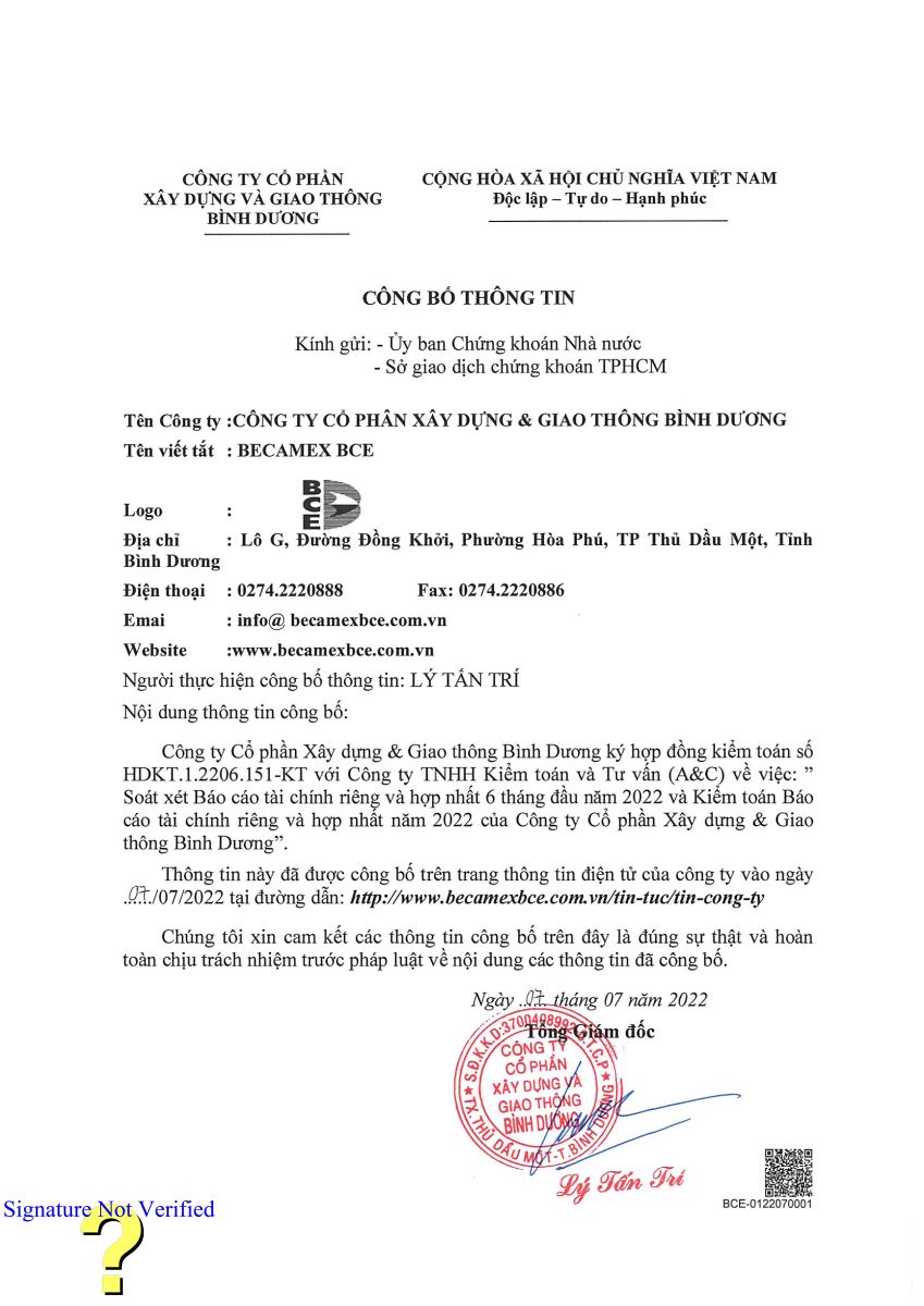 Công ty Cổ phần Xây dựng và Giao thông Bình Dương xin Công bố thông tin đến quý cổ đông về việc ký Hợp đồng kiểm toán cho báo cáo tài chính 2022. Quý Cổ đông vui long tải file tại đây