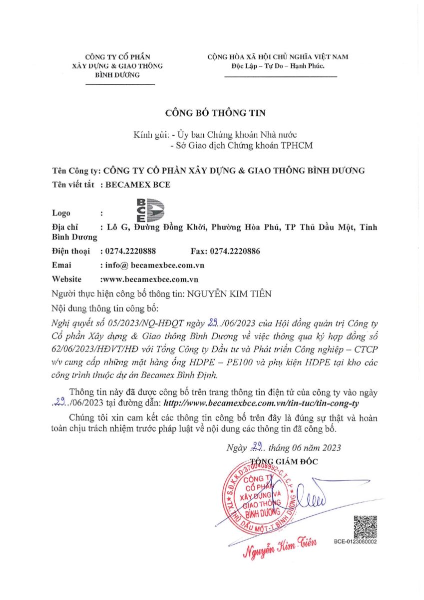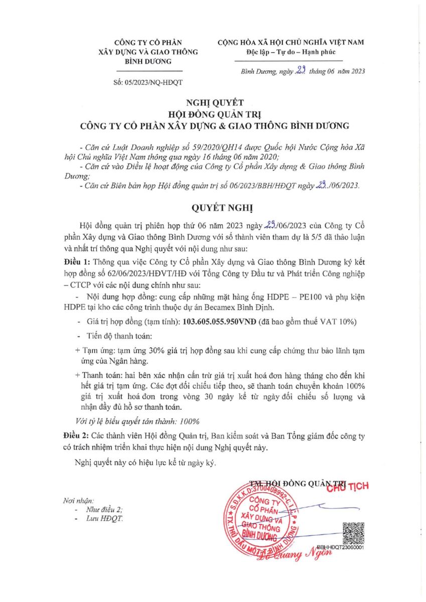 Công ty BCE CBTT Nghị quyết số 05/2023/NQ-HĐQT v/v ký Hợp đồng với Tổng cty Đầu tư và Phát triển Công nghiệp - CTCP.