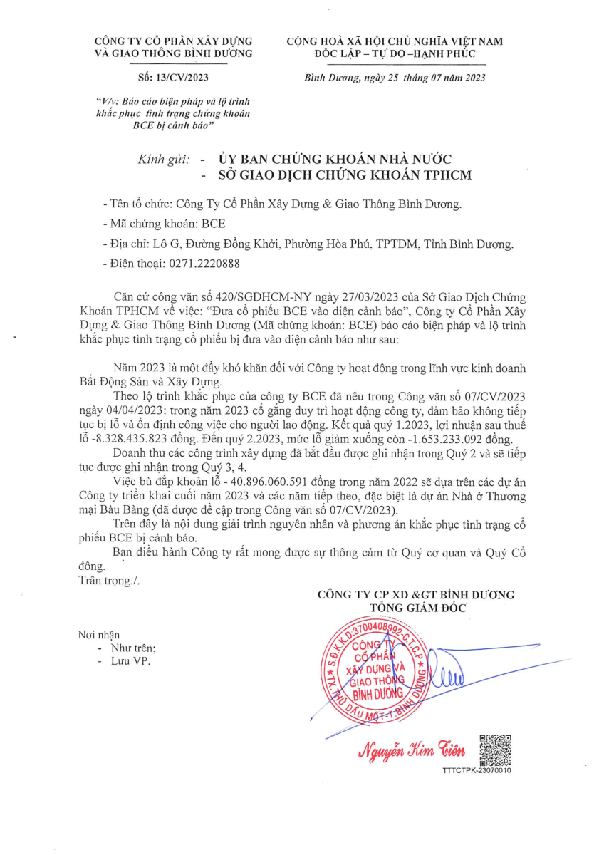 Công ty CP Xây dựng và Giao thông Bình Dương báo cáo biện pháp và lộ trình khắc phục tình trạng CK BCE bị cảnh báo (Quý 2.2023)