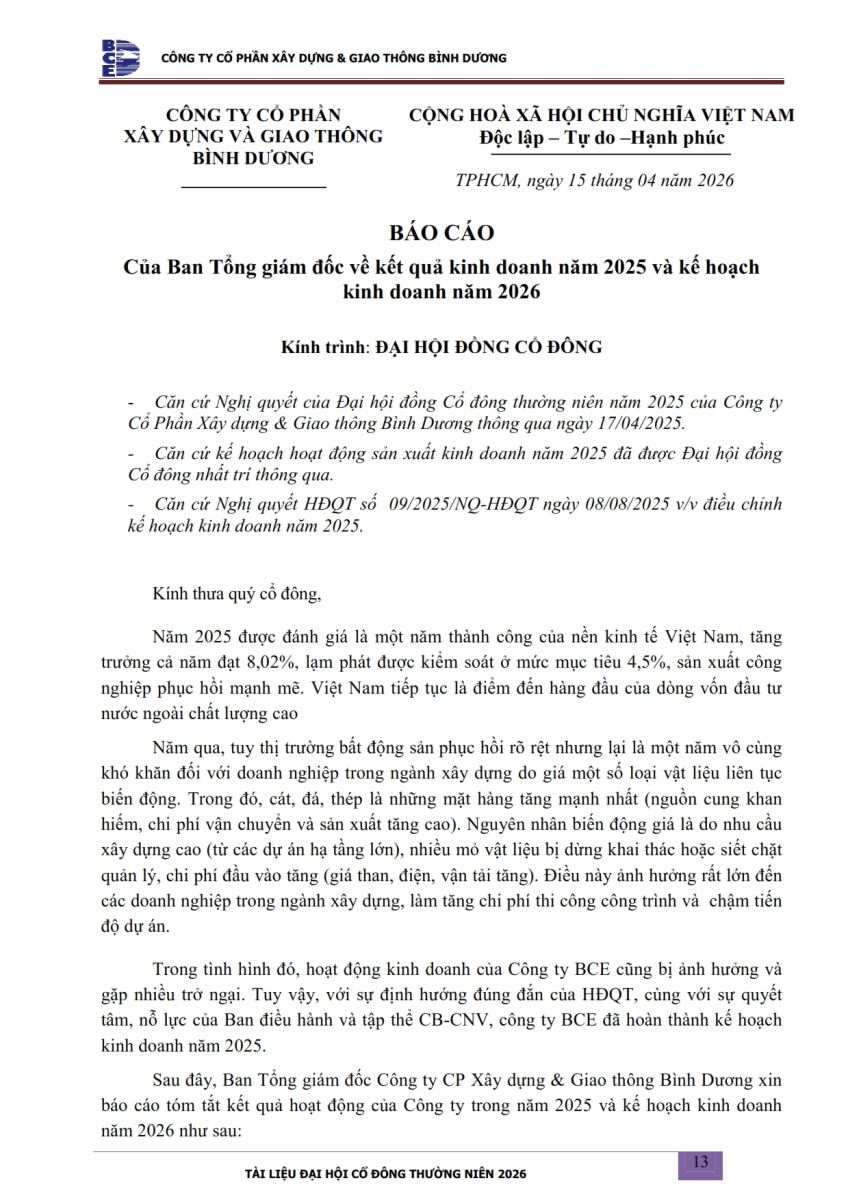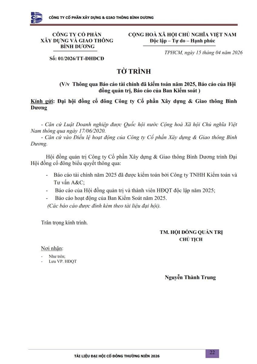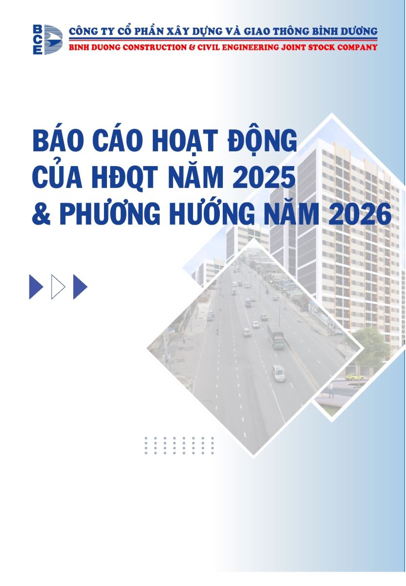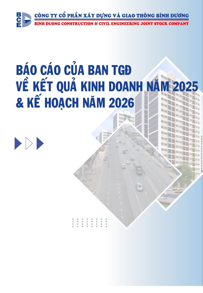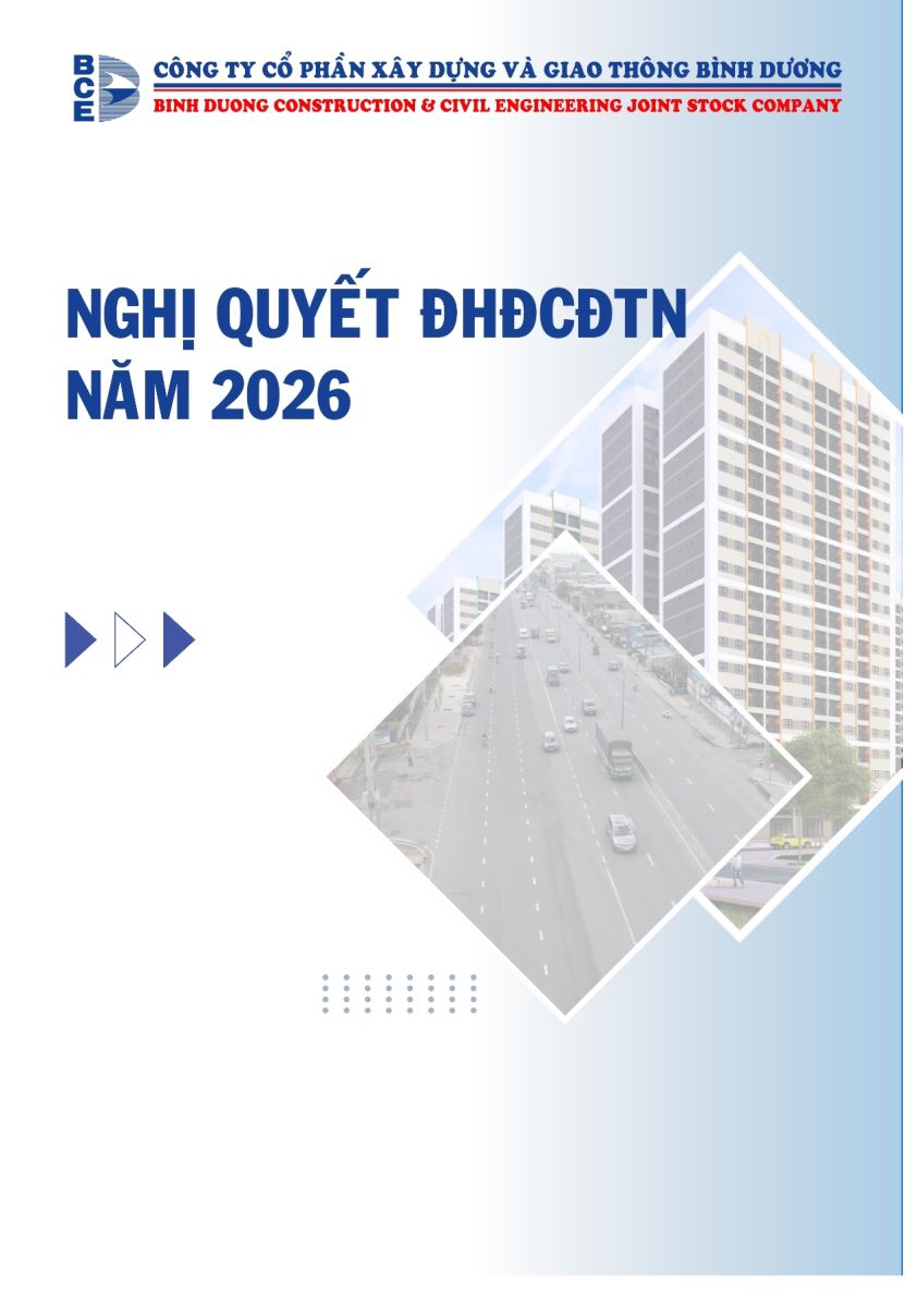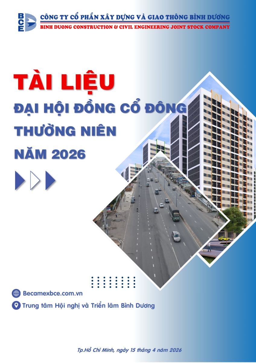 Ngày đăng: 13/04/2026 Công ty Cổ phần Xây dựng và Giao thông Bình Dương công bố tài liệu Cổ đông thường niên năm 2026. Binh Duong Construction & Civil Engineering Joint Stock Company discloses the documents for the 2026 Annual General Meeting of Shareholders.