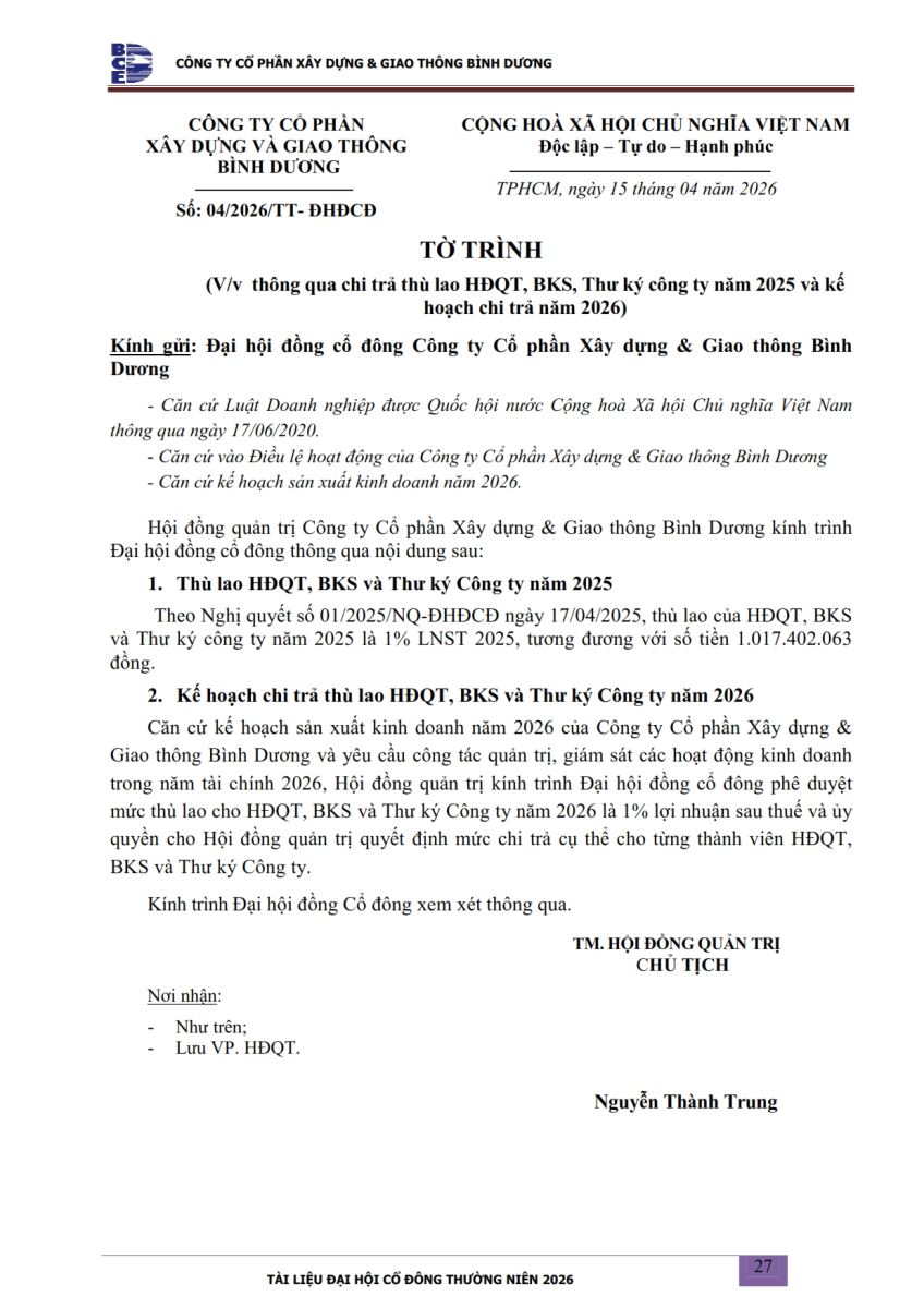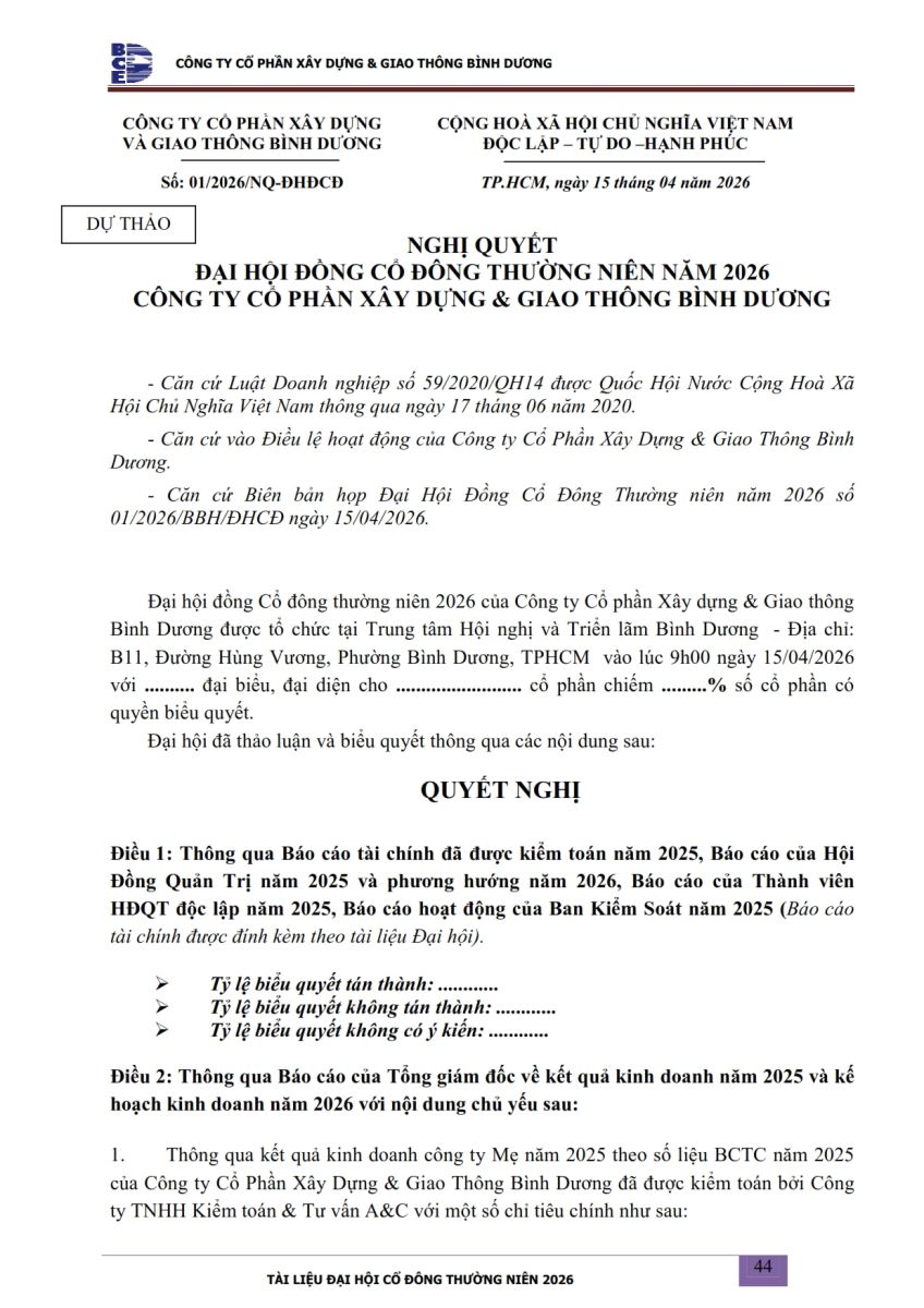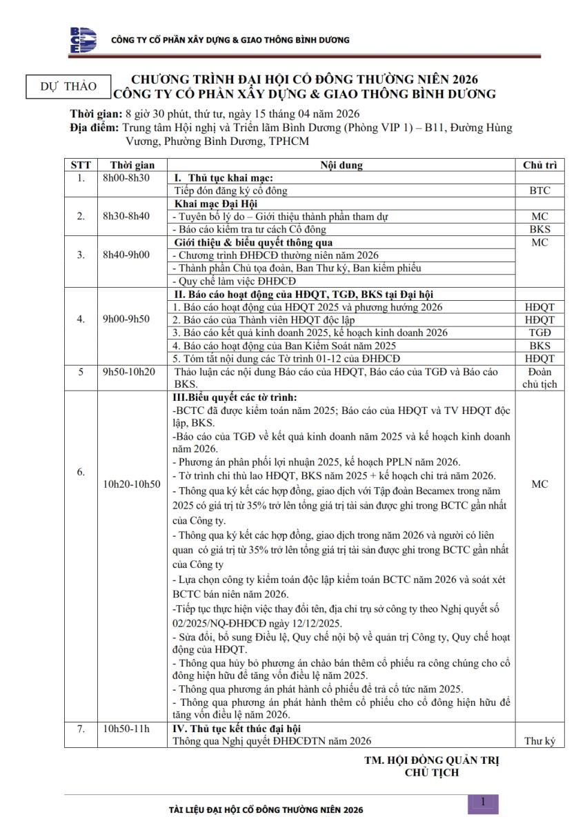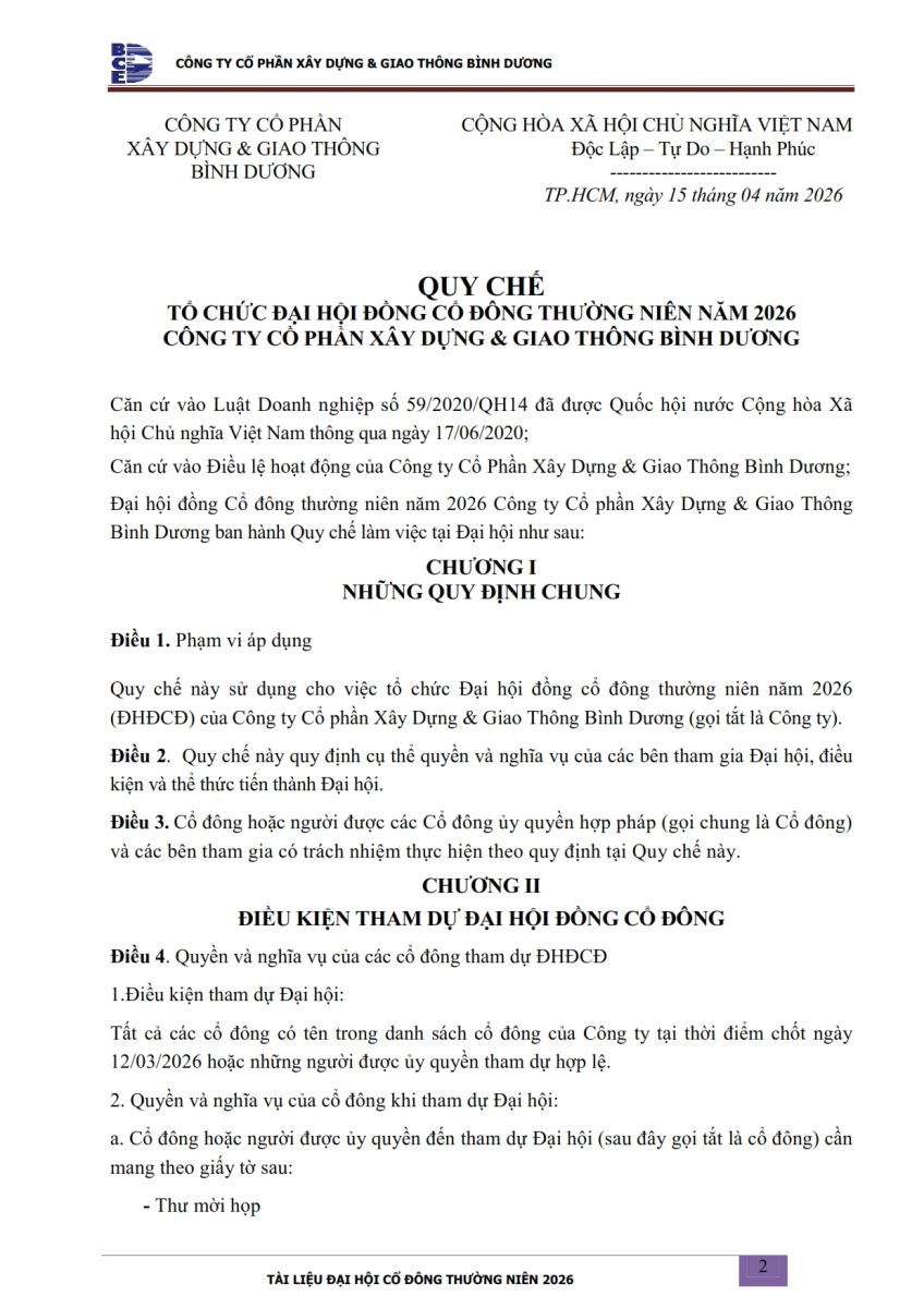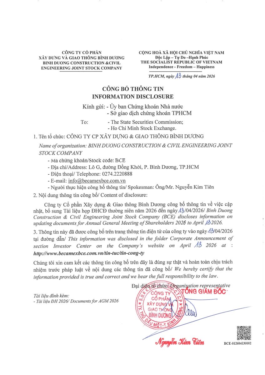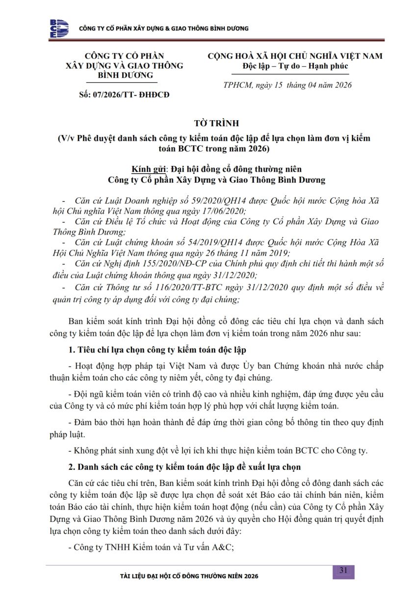 Ngày đăng: 13/04/2026 Công ty Cổ phần Xây dựng và Giao thông Bình Dương công bố tài liệu Cổ đông thường niên năm 2026. Binh Duong Construction & Civil Engineering Joint Stock Company discloses the documents for the 2026 Annual General Meeting of Shareholders.