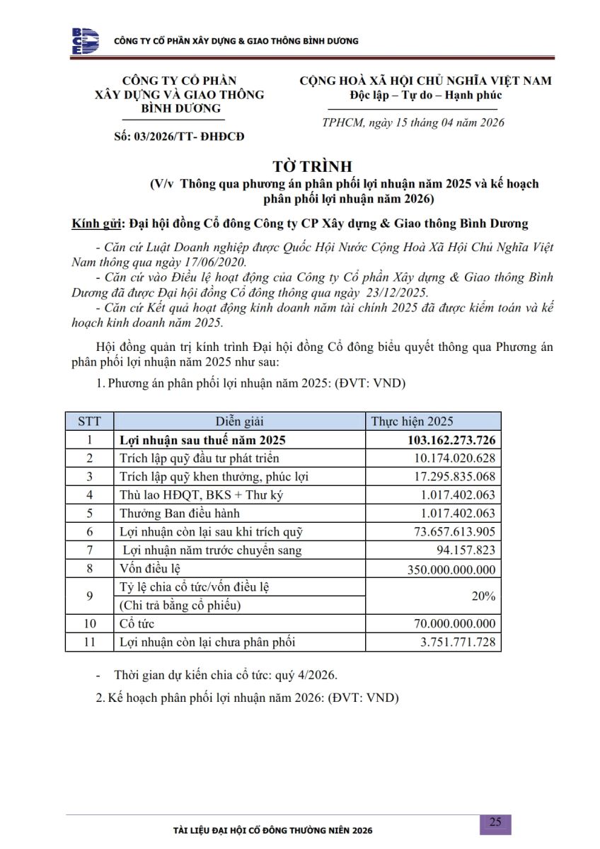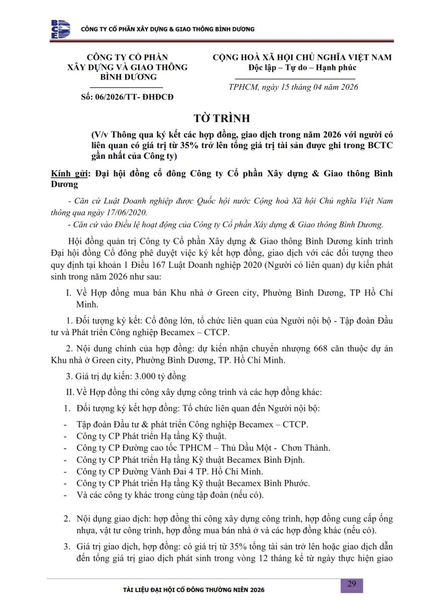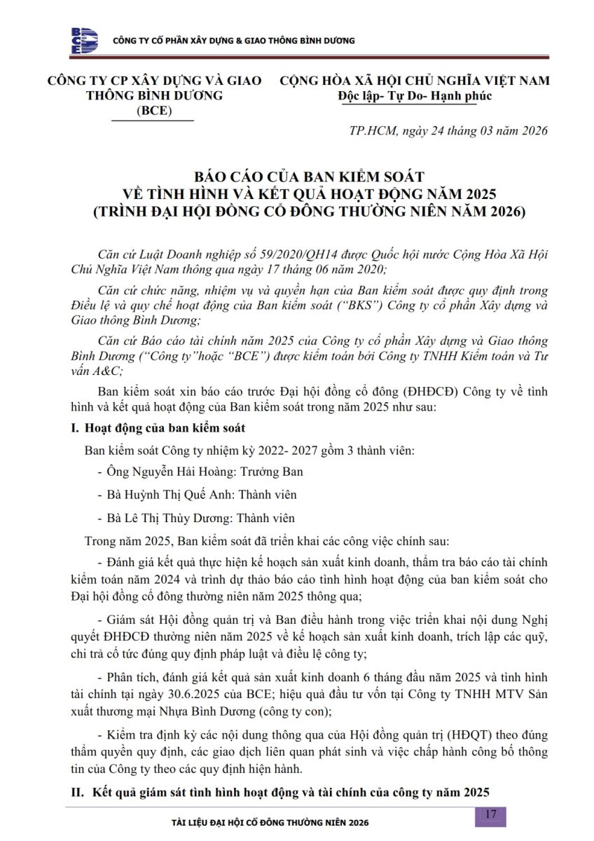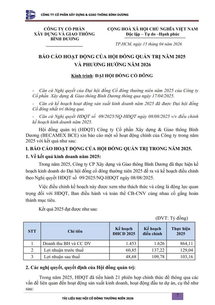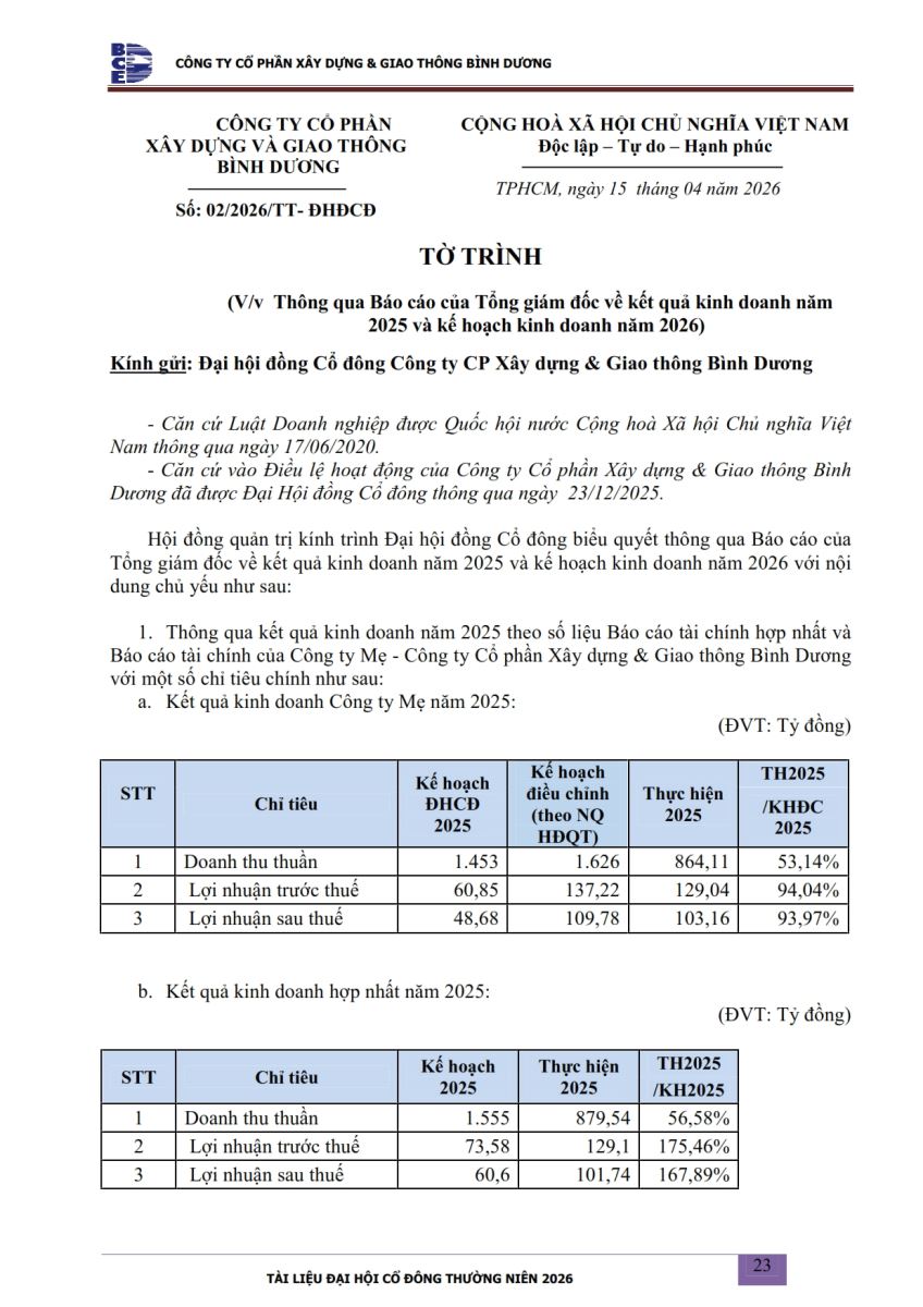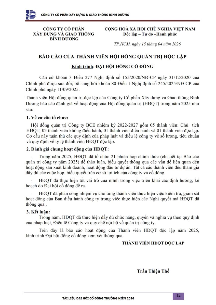 Ngày đăng: 13/04/2026 Công ty Cổ phần Xây dựng và Giao thông Bình Dương công bố tài liệu Cổ đông thường niên năm 2026. Binh Duong Construction & Civil Engineering Joint Stock Company discloses the documents for the 2026 Annual General Meeting of Shareholders.