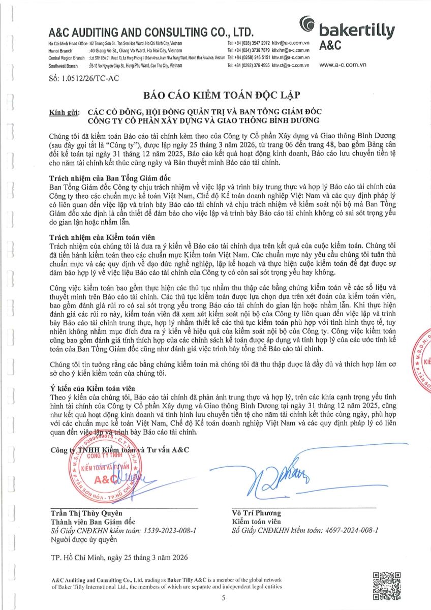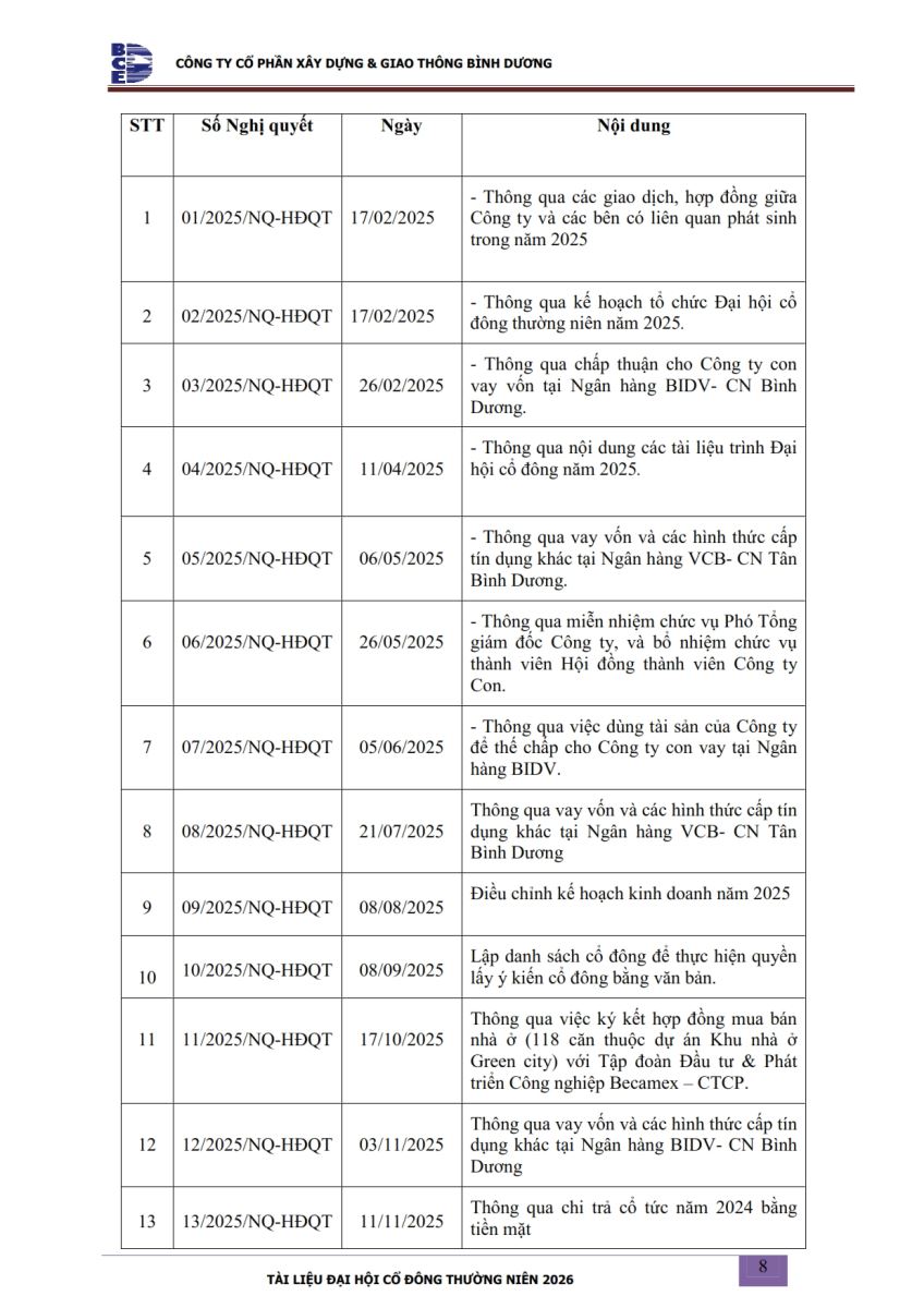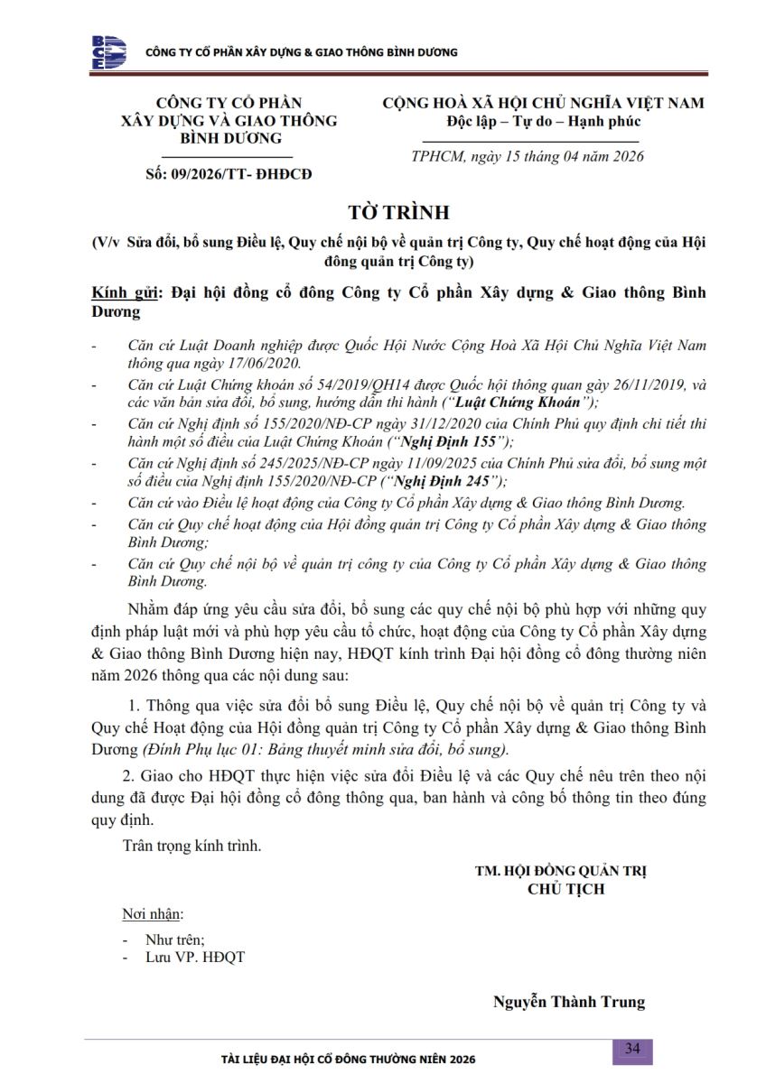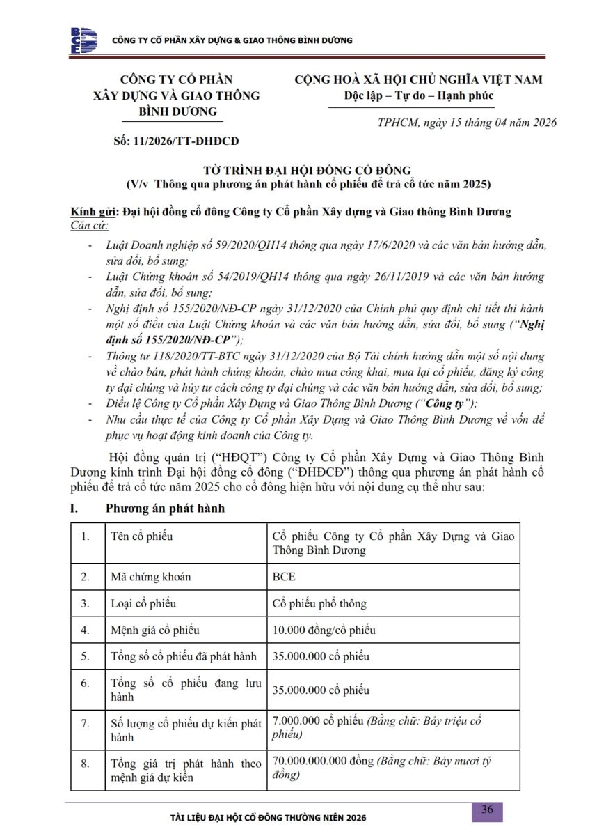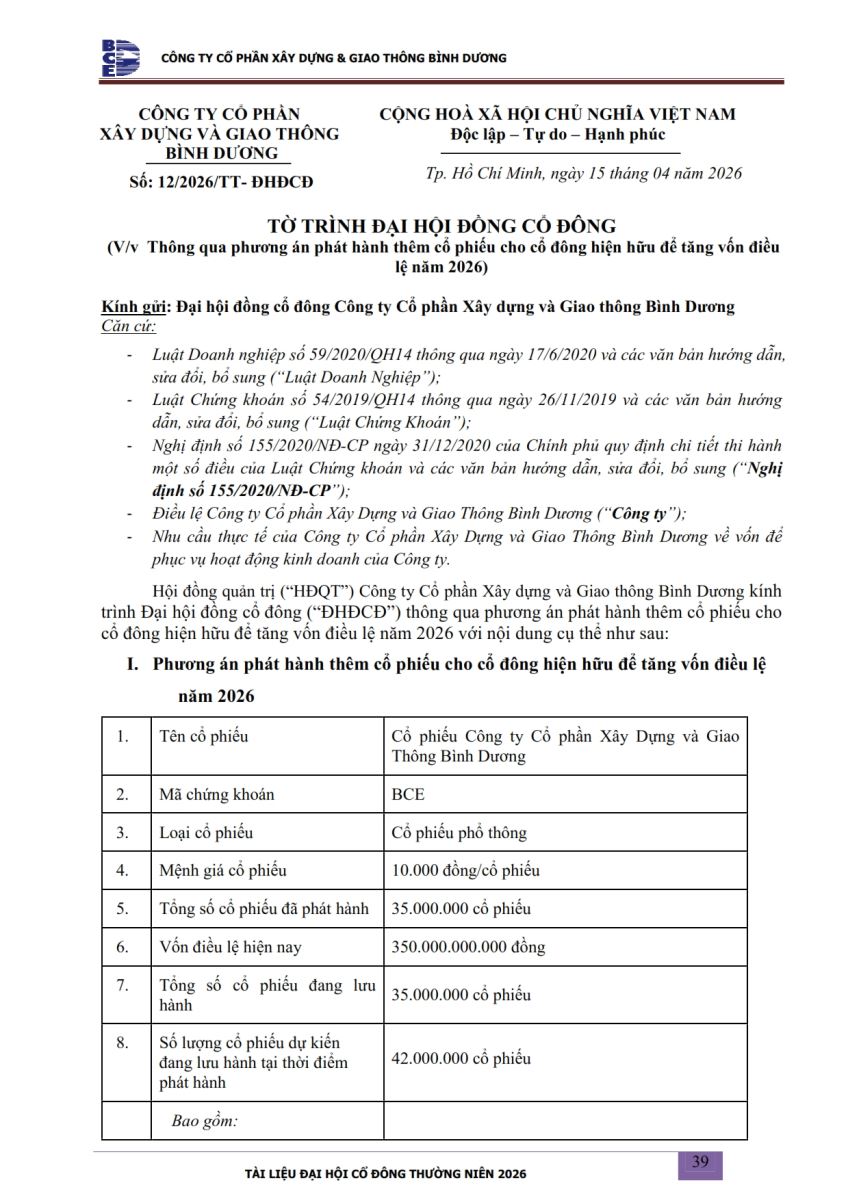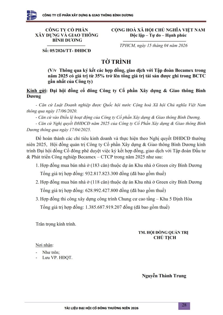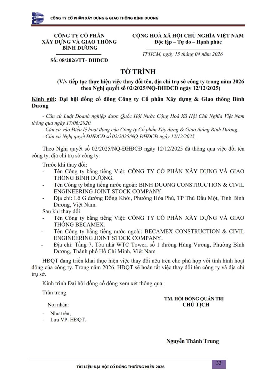 Ngày đăng: 13/04/2026 Công ty Cổ phần Xây dựng và Giao thông Bình Dương công bố tài liệu Cổ đông thường niên năm 2026. Binh Duong Construction & Civil Engineering Joint Stock Company discloses the documents for the 2026 Annual General Meeting of Shareholders.