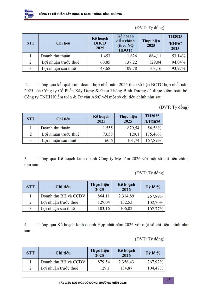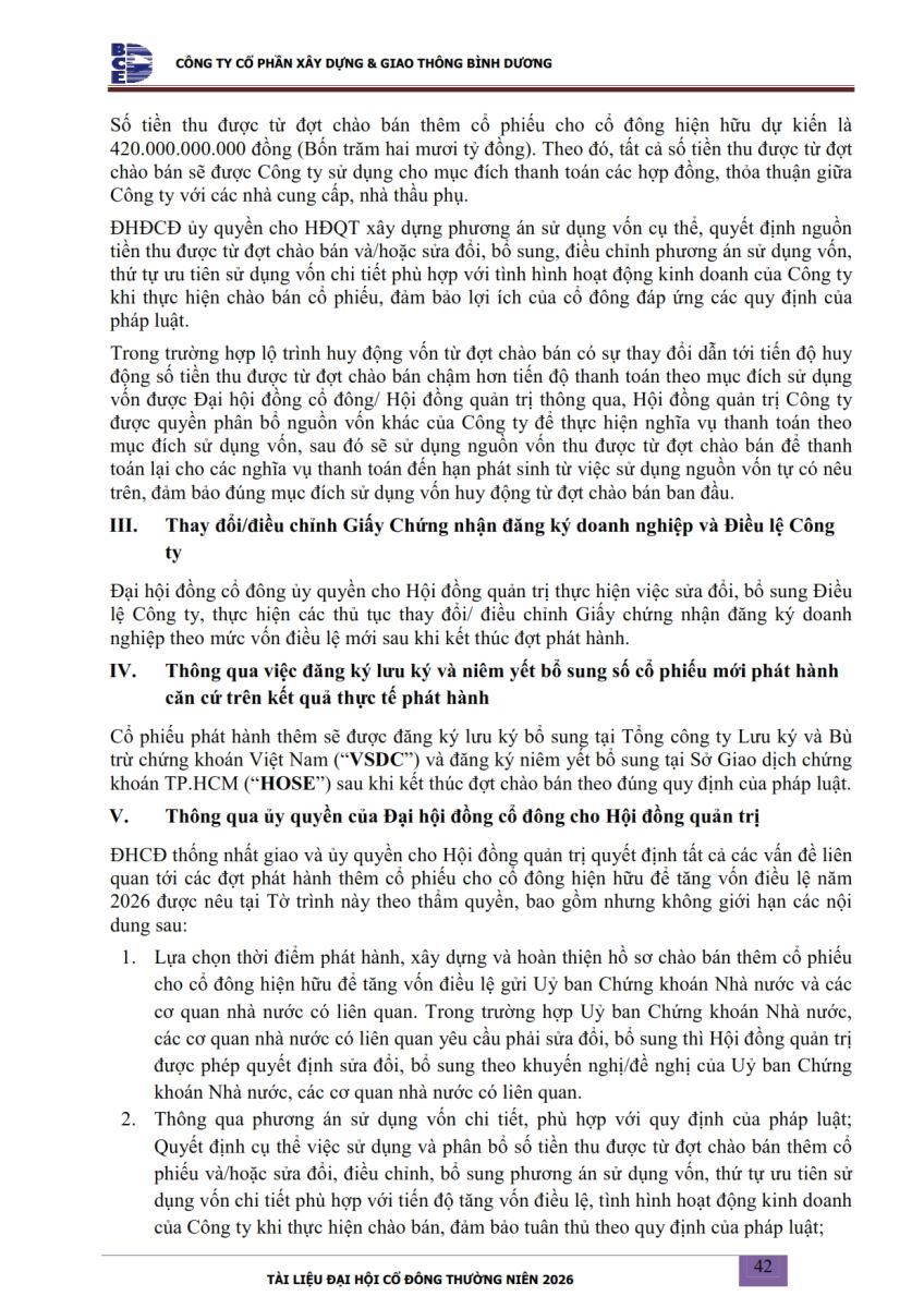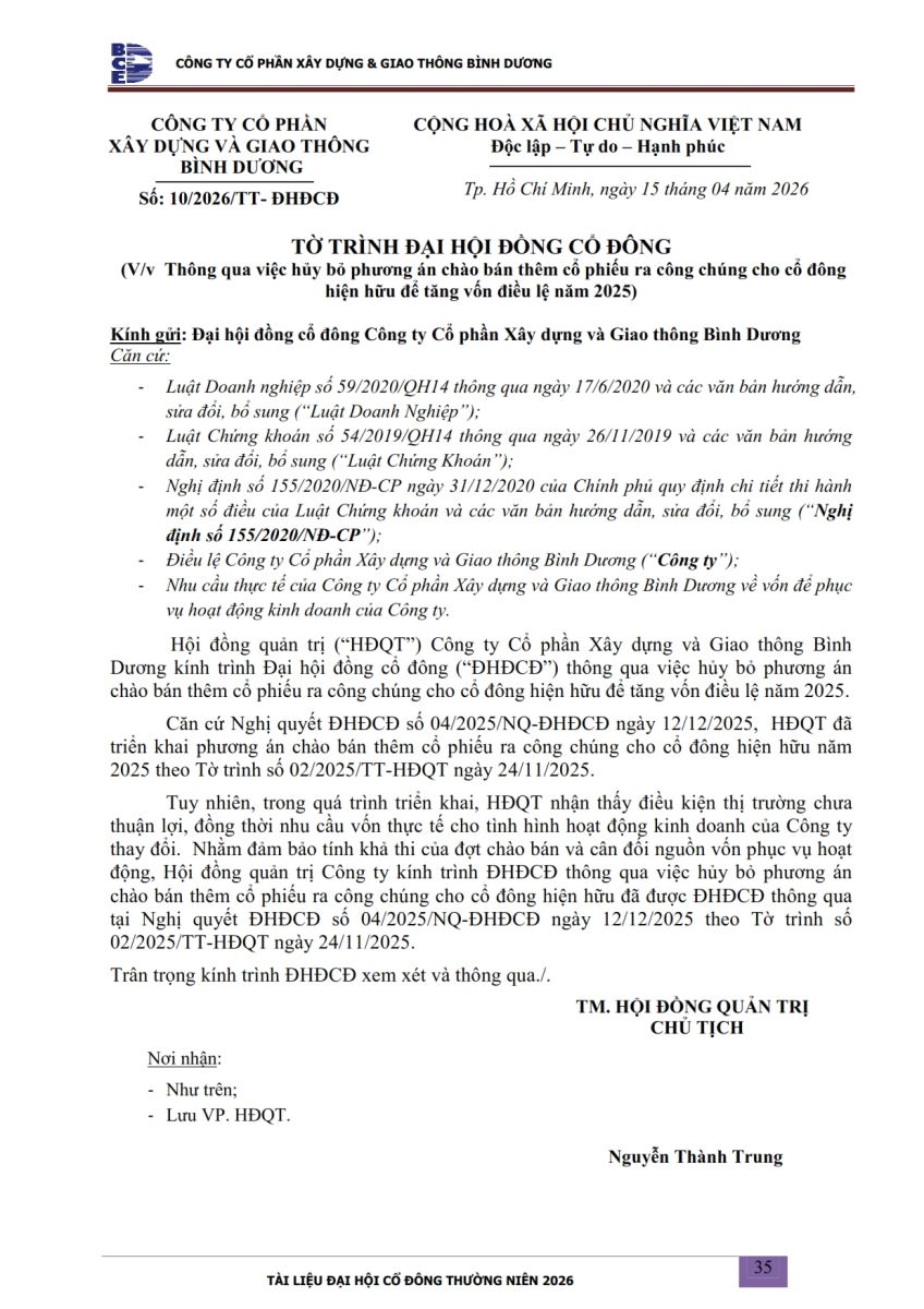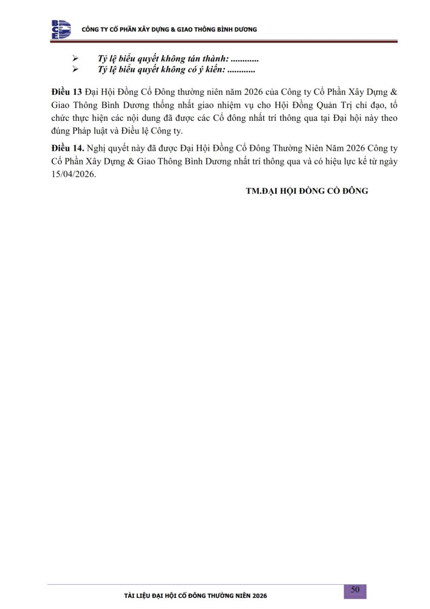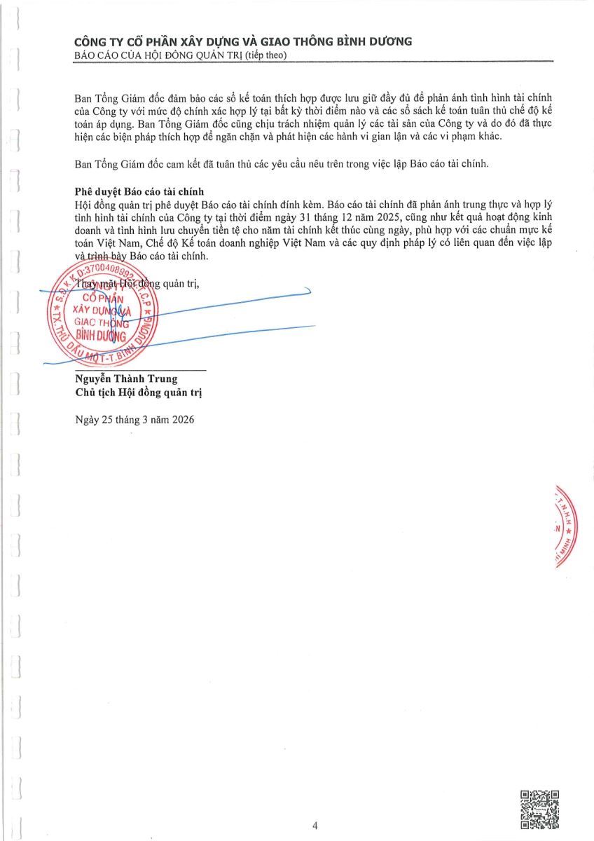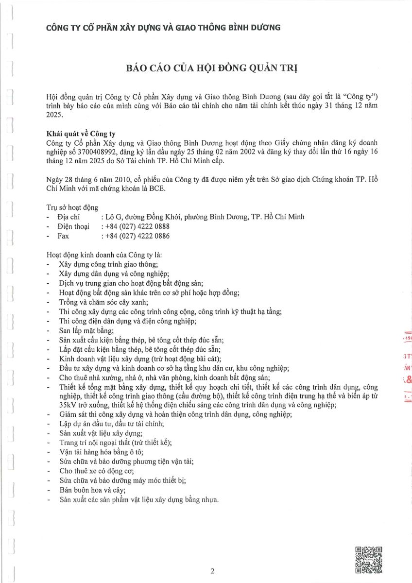 Ngày đăng: 13/04/2026 Công ty Cổ phần Xây dựng và Giao thông Bình Dương công bố tài liệu Cổ đông thường niên năm 2026. Binh Duong Construction & Civil Engineering Joint Stock Company discloses the documents for the 2026 Annual General Meeting of Shareholders.