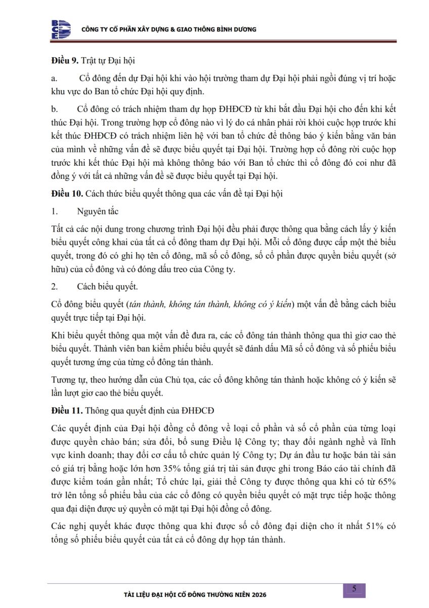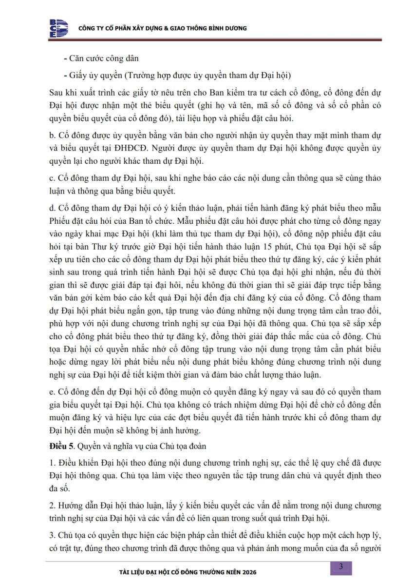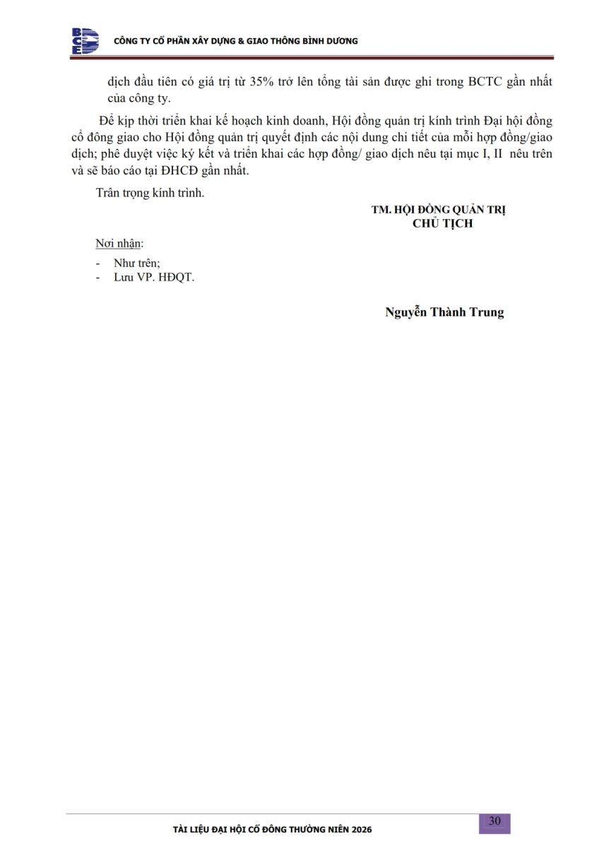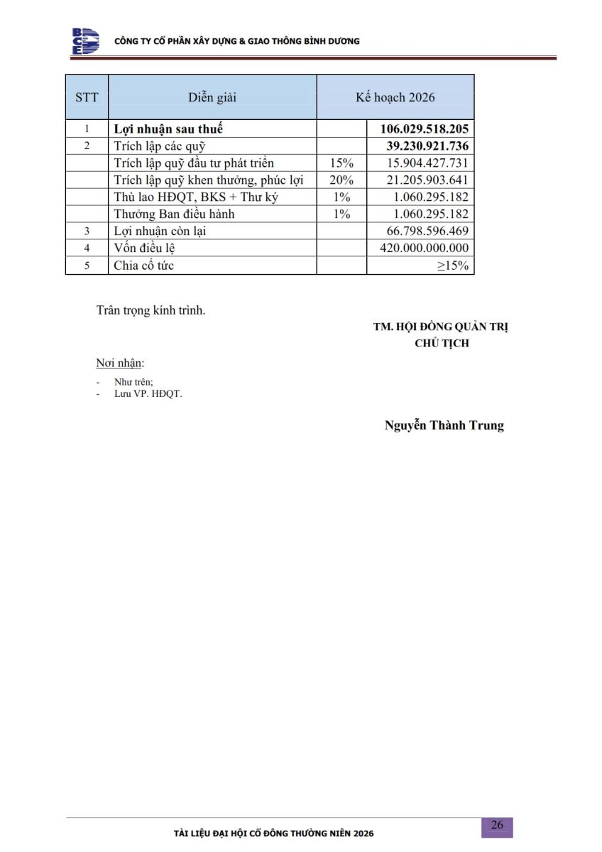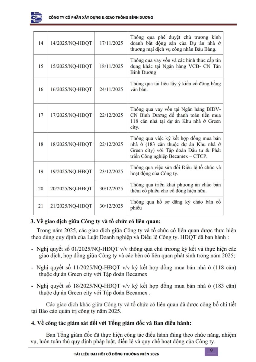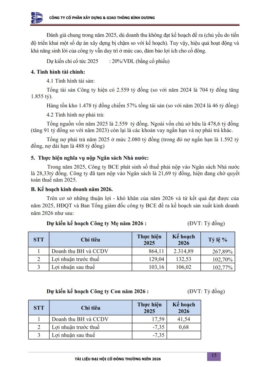 Ngày đăng: 13/04/2026 Công ty Cổ phần Xây dựng và Giao thông Bình Dương công bố tài liệu Cổ đông thường niên năm 2026. Binh Duong Construction & Civil Engineering Joint Stock Company discloses the documents for the 2026 Annual General Meeting of Shareholders.
