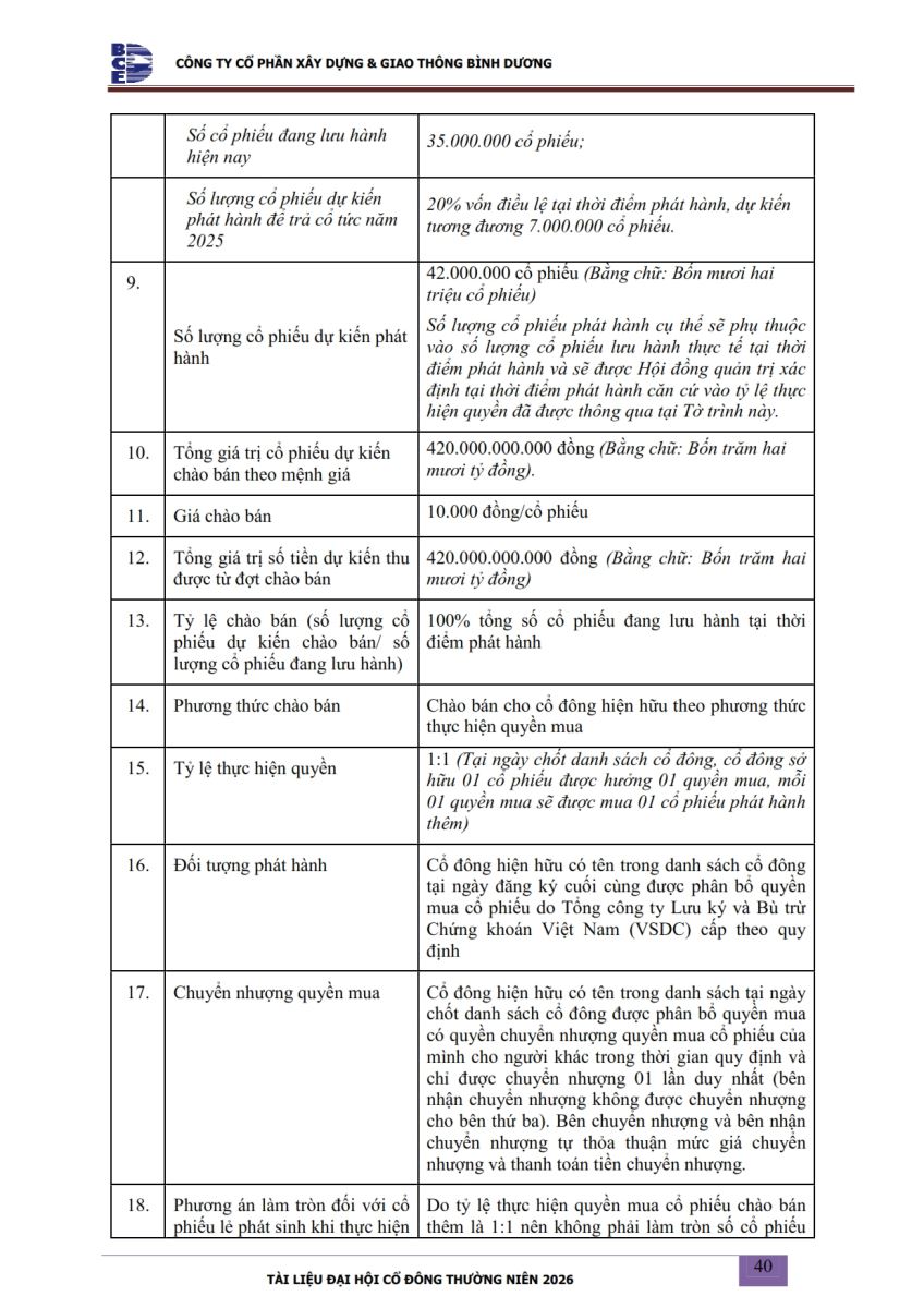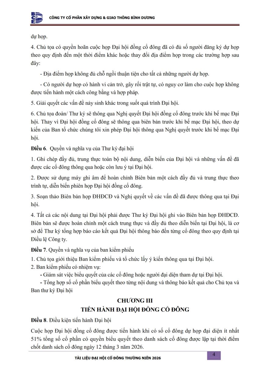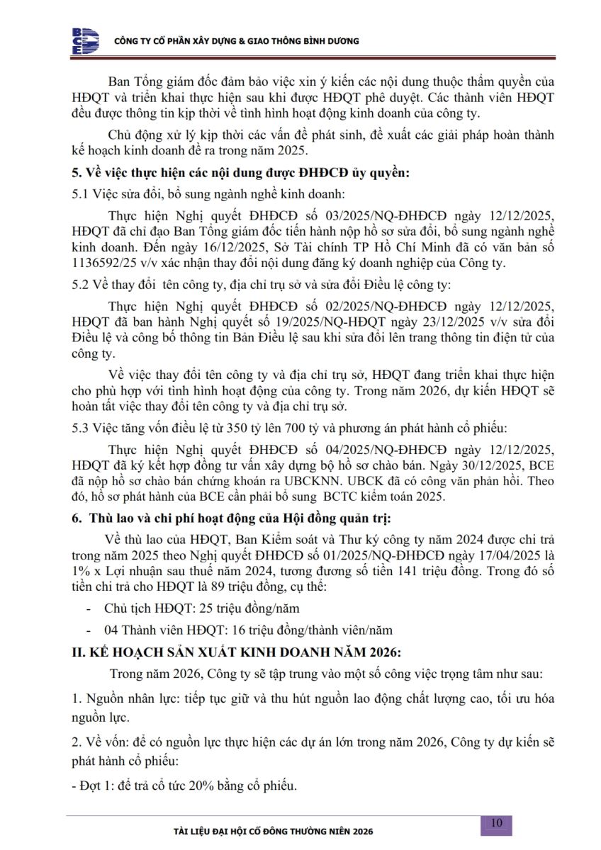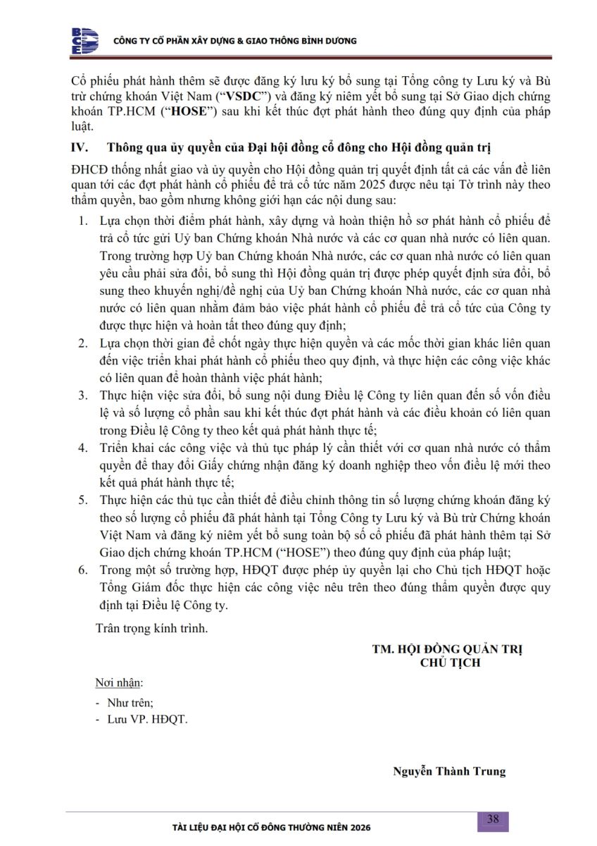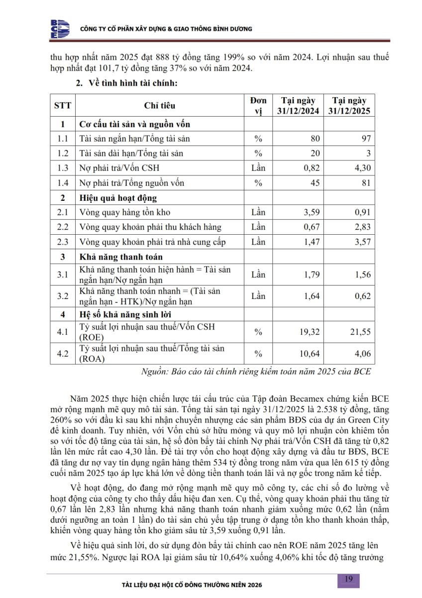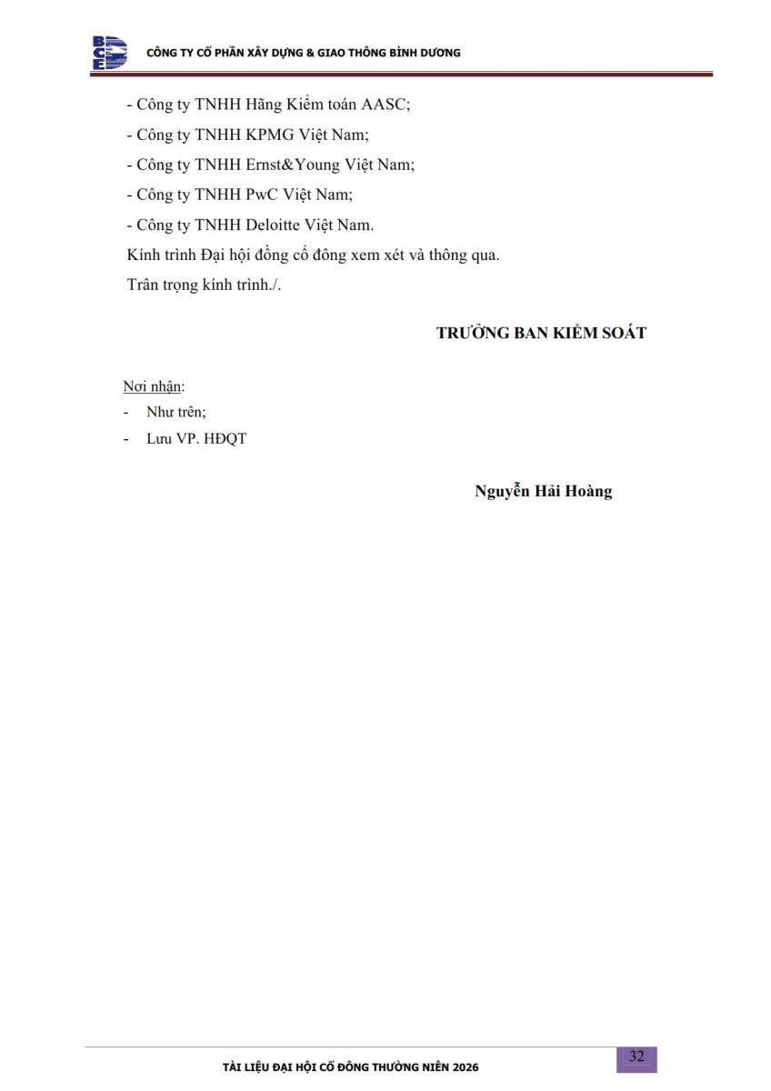Ngày đăng: 13/04/2026 Công ty Cổ phần Xây dựng và Giao thông Bình Dương công bố tài liệu Cổ đông thường niên năm 2026. Binh Duong Construction & Civil Engineering Joint Stock Company discloses the documents for the 2026 Annual General Meeting of Shareholders.