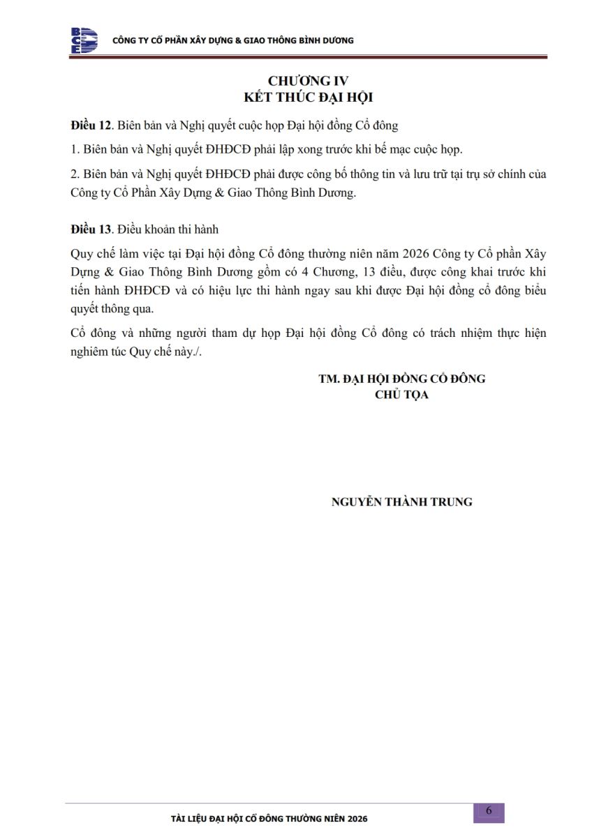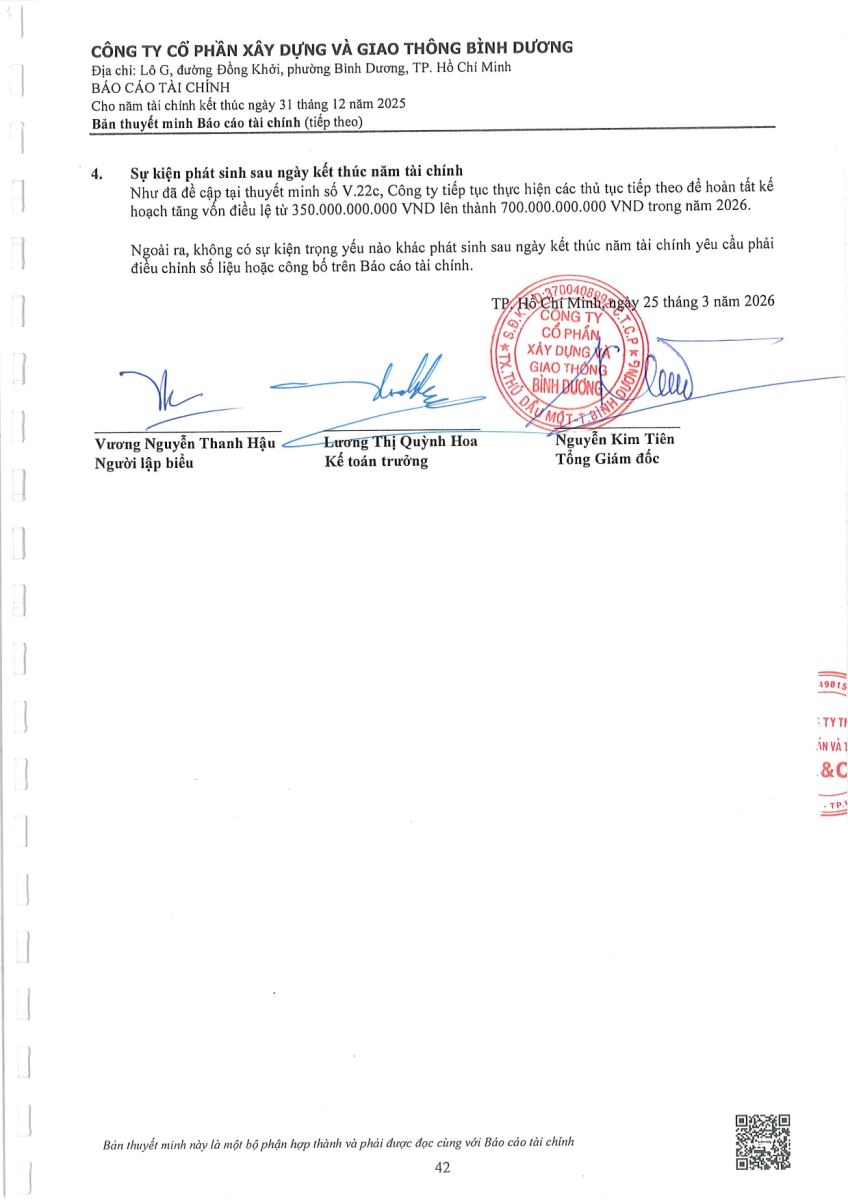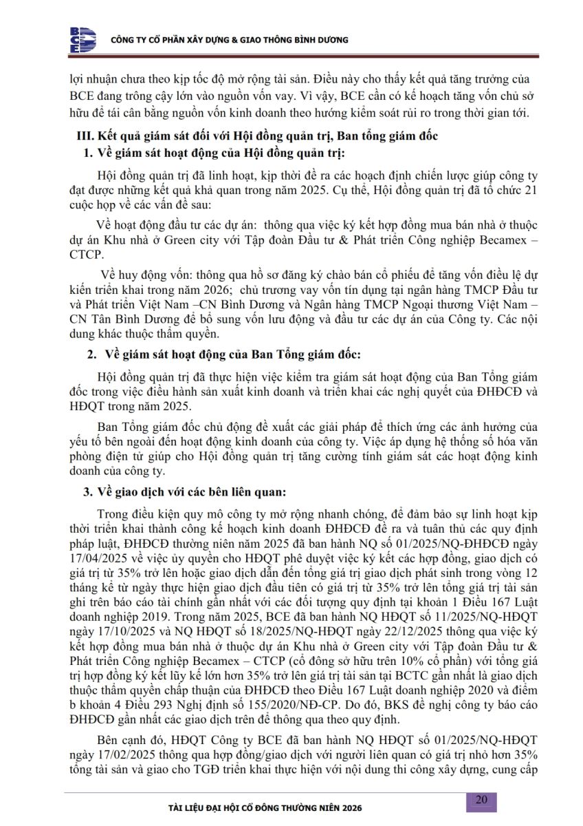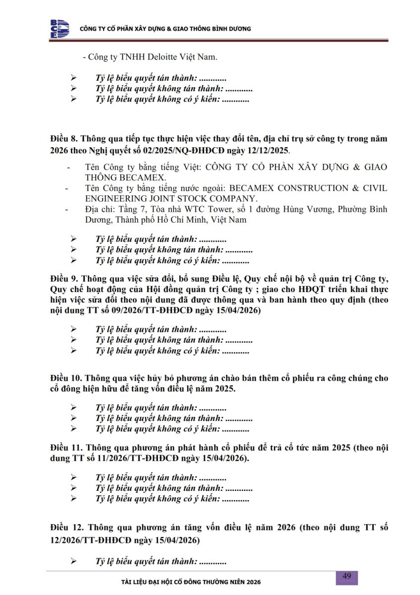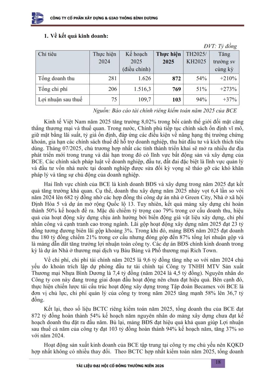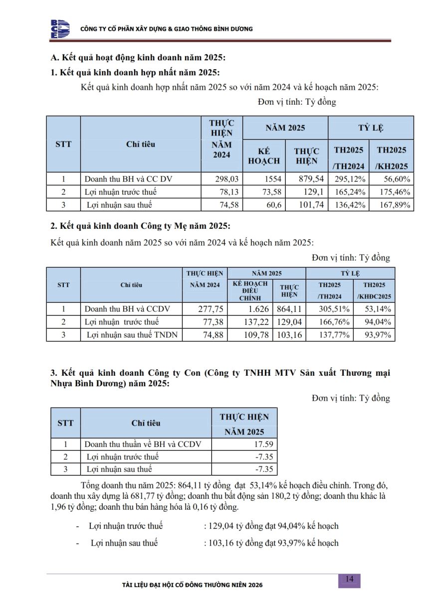 Ngày đăng: 13/04/2026 Công ty Cổ phần Xây dựng và Giao thông Bình Dương công bố tài liệu Cổ đông thường niên năm 2026. Binh Duong Construction & Civil Engineering Joint Stock Company discloses the documents for the 2026 Annual General Meeting of Shareholders.