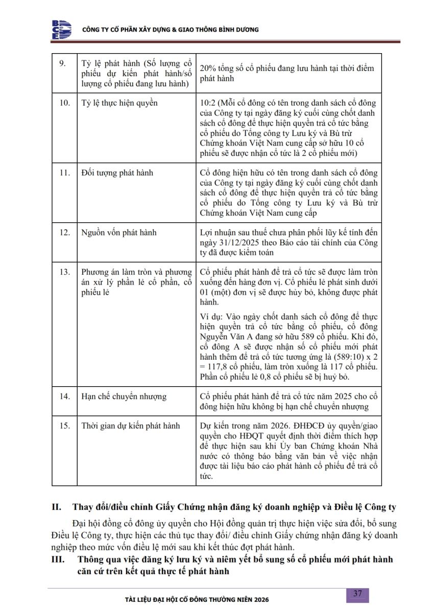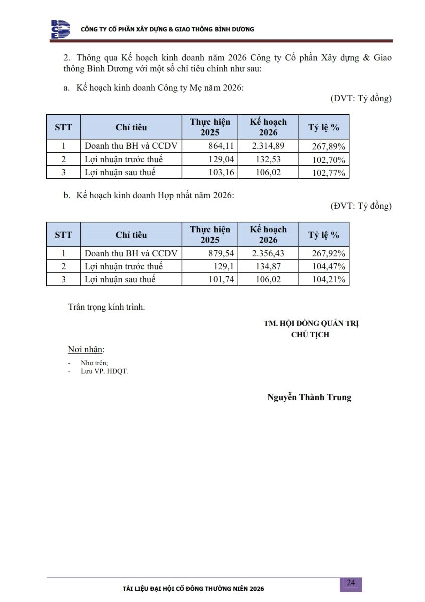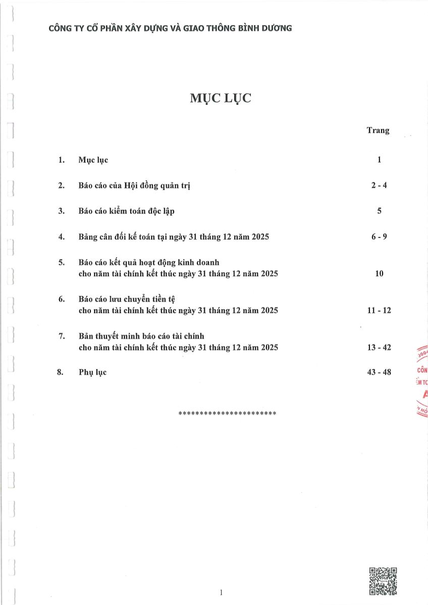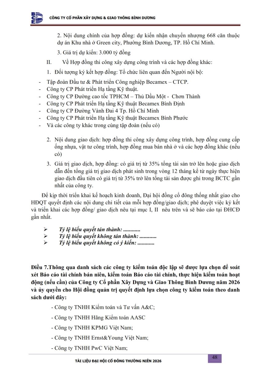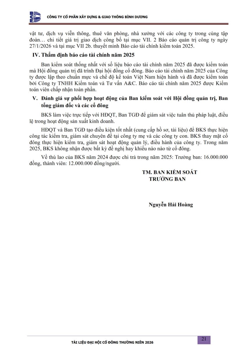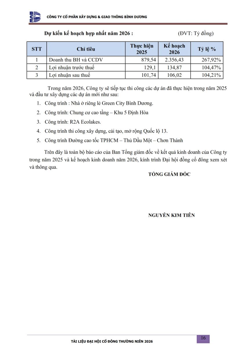 Ngày đăng: 13/04/2026 Công ty Cổ phần Xây dựng và Giao thông Bình Dương công bố tài liệu Cổ đông thường niên năm 2026. Binh Duong Construction & Civil Engineering Joint Stock Company discloses the documents for the 2026 Annual General Meeting of Shareholders.