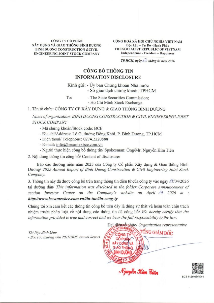 Ngày đăng: 17/04/2026 Công ty Cổ phần Xây dựng và Giao thông Bình Dương công bố báo cáo thường niên năm 2025. Binh Duong Construction & Civil Engineering Joint Stock Company announces the 2025 Annual Report.