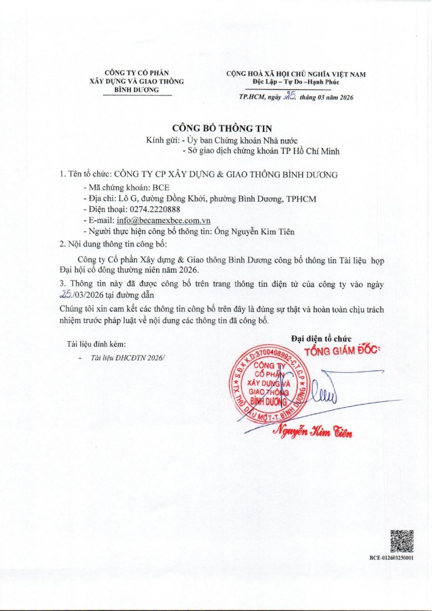 Công ty Cổ phần Xây dựng và Giao thông Bình Dương công bố thông tin: