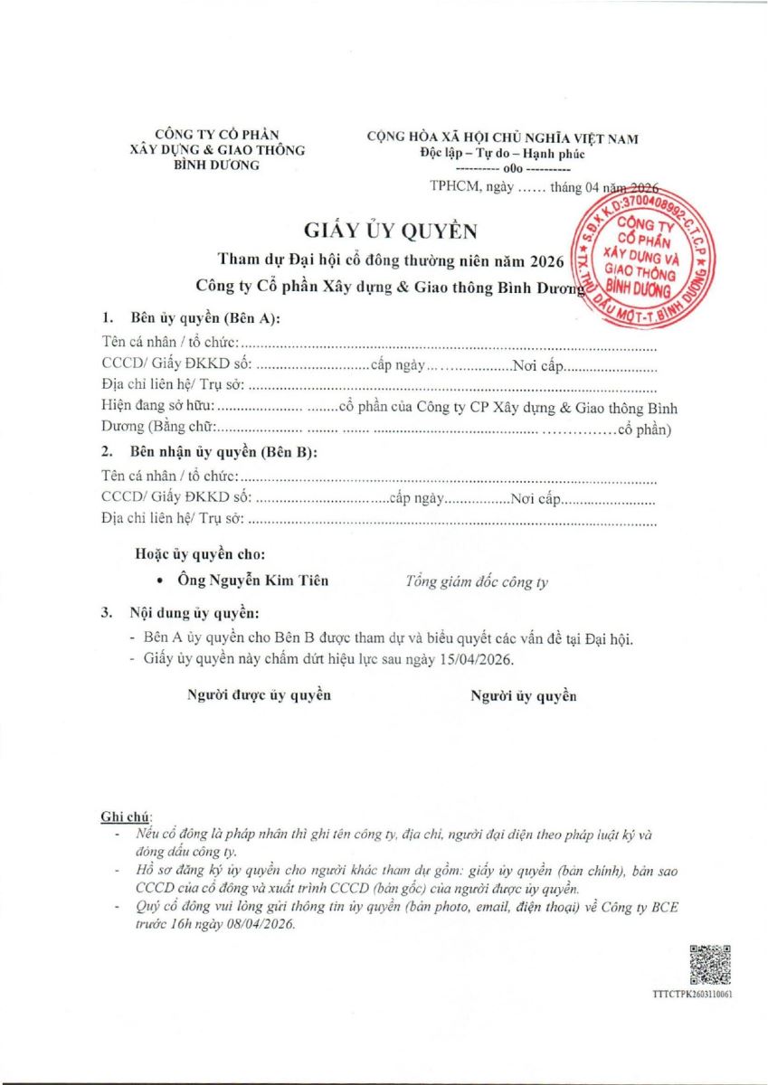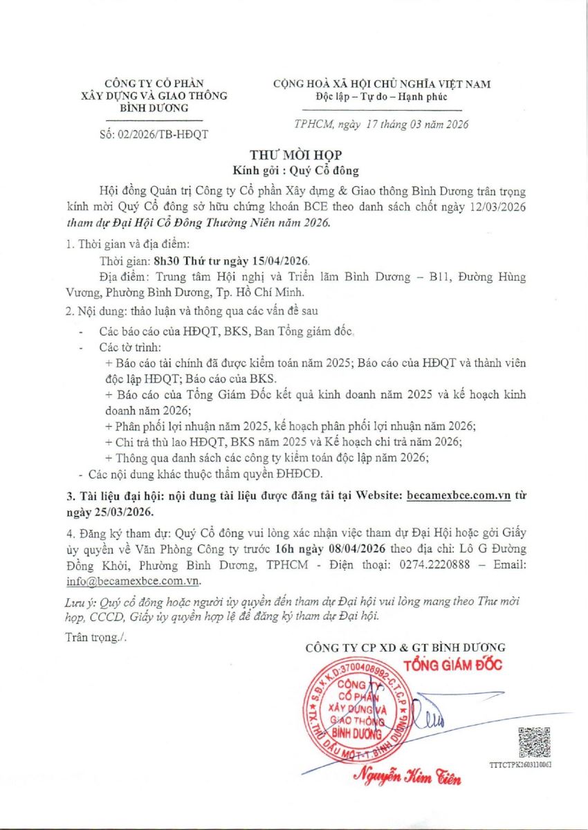 Công ty Cổ phần Xây dựng và Giao thông Bình Dương kính mời quý cổ đông tham dự Đại hội Cổ đông thường niên 2026. Trong trường hợp chưa nhận được thư mời quý cổ đông vui lòng tải giấy mời họp và giấy ủy quyền tham dự tại đây.