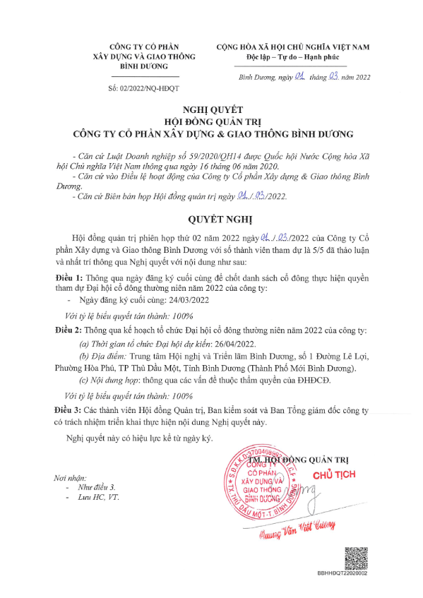 Ngày đăng: 01/03/2022 Nghị quyết về ngày đăng ký cuối cùng để thực hiện quyền Tham dự ĐHCĐTN 2022. Ngày ĐKCC: 24/03/2022