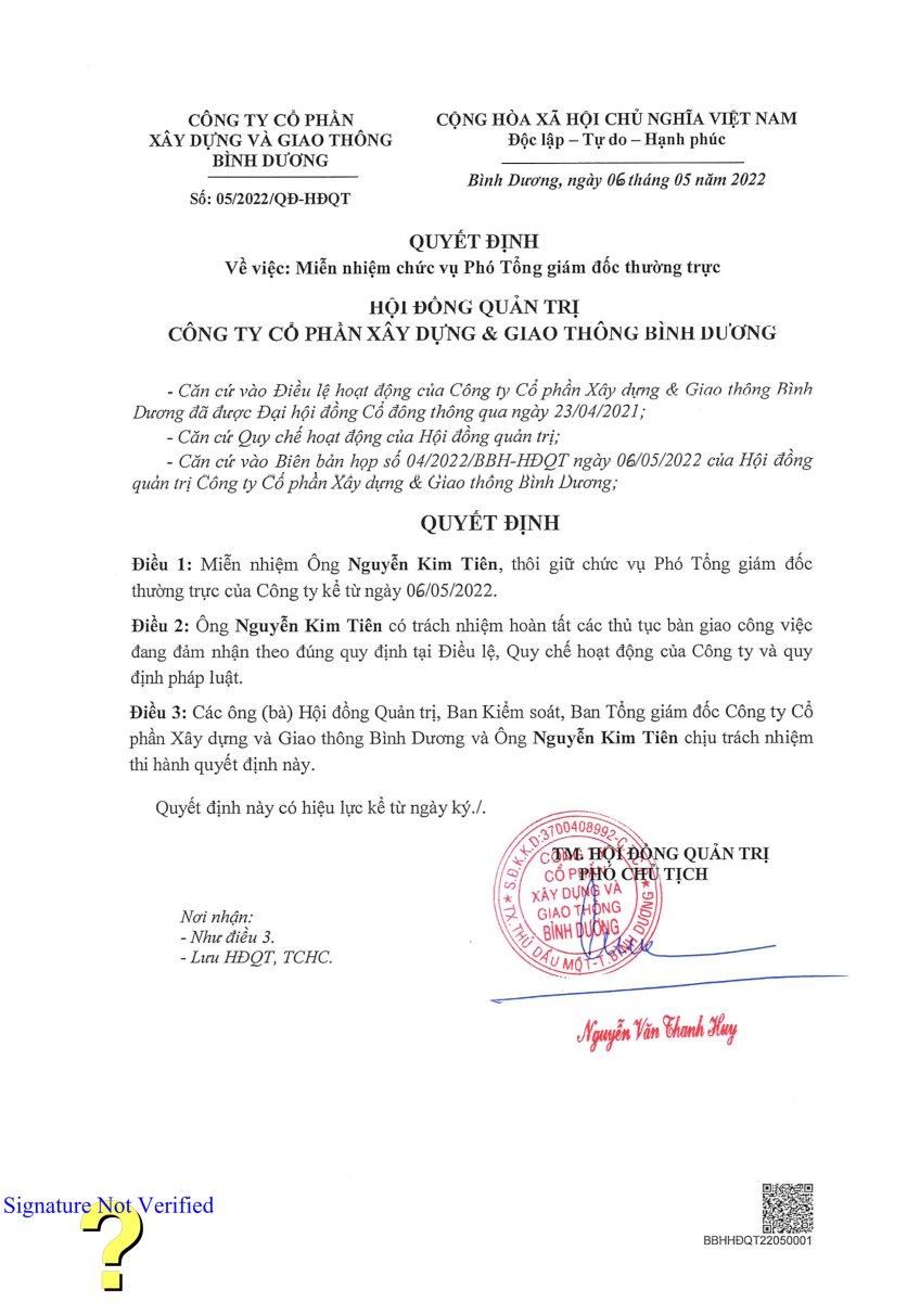 Quyết định số 05/2022/QĐ-HDQT về việc miễn nhiệm chức vụ Phó Tổng Giám đốc thường trực.