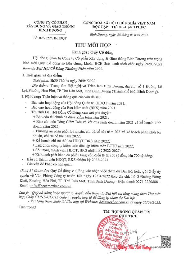 Thư mời Đại hội cổ đông thường niên năm 2022